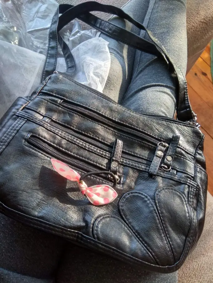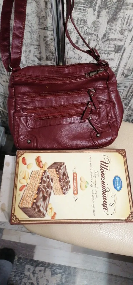 получила вторую классную сумочку бордового красивого цвета.много карманов маленькая аккуратная вместительная все что мне надо для поездки на работу поместилось.очень доволна.спасибо продавцам и за бантик спасибо