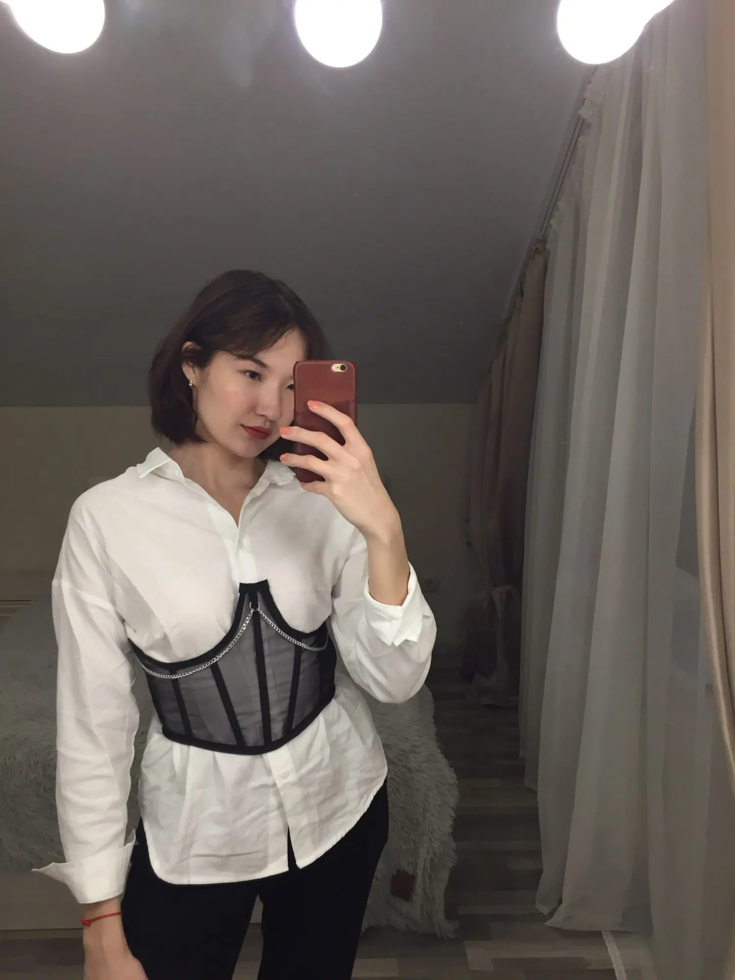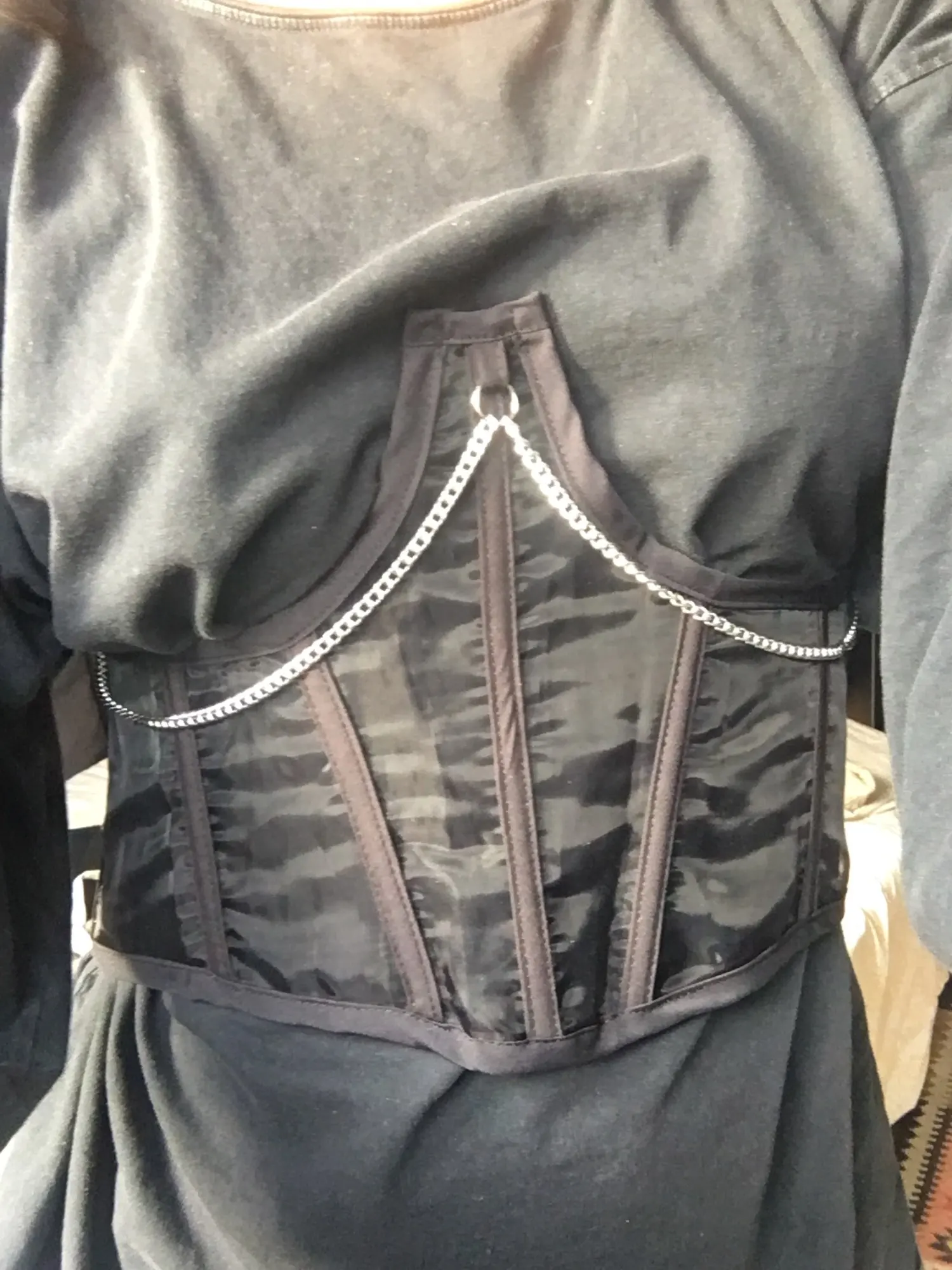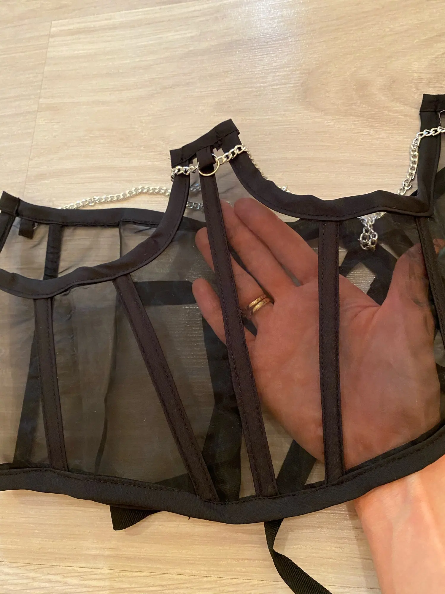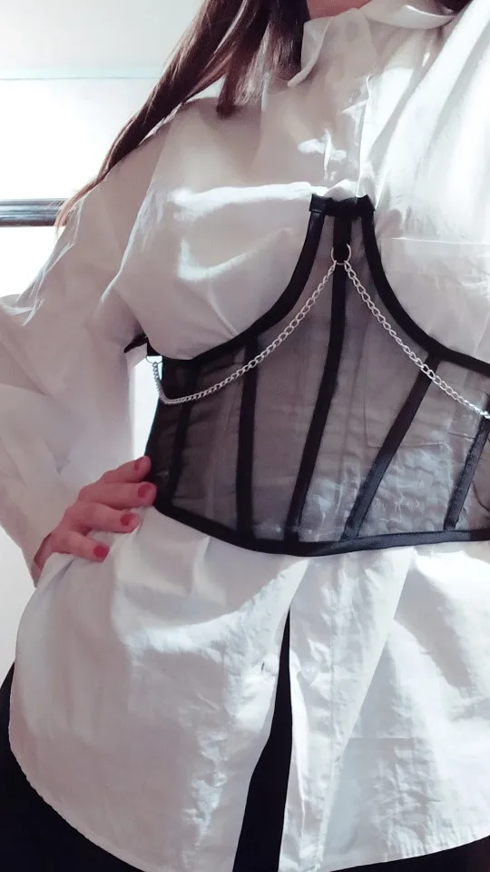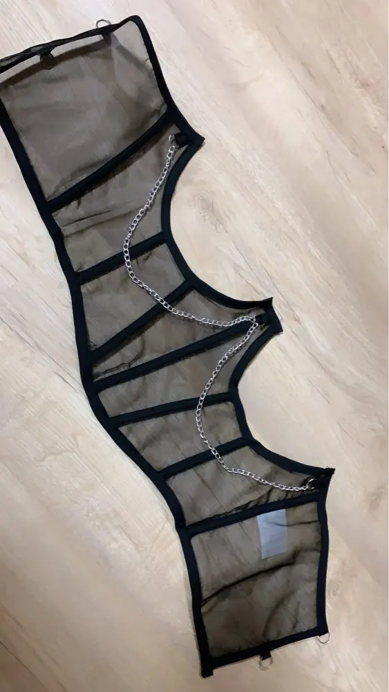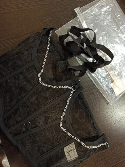 доставка заняла месяц корсет выполнен из тонкой плотной тюлевой ткани, имеются вставки, держащие осанку. Сзади шнуровка. Мне очень понравился декоративный элемент в виде цепей на выбор в белом, телесном и чёрном цветах на ОТ 72см взяла размер L, можно брать смело М, места достаточно