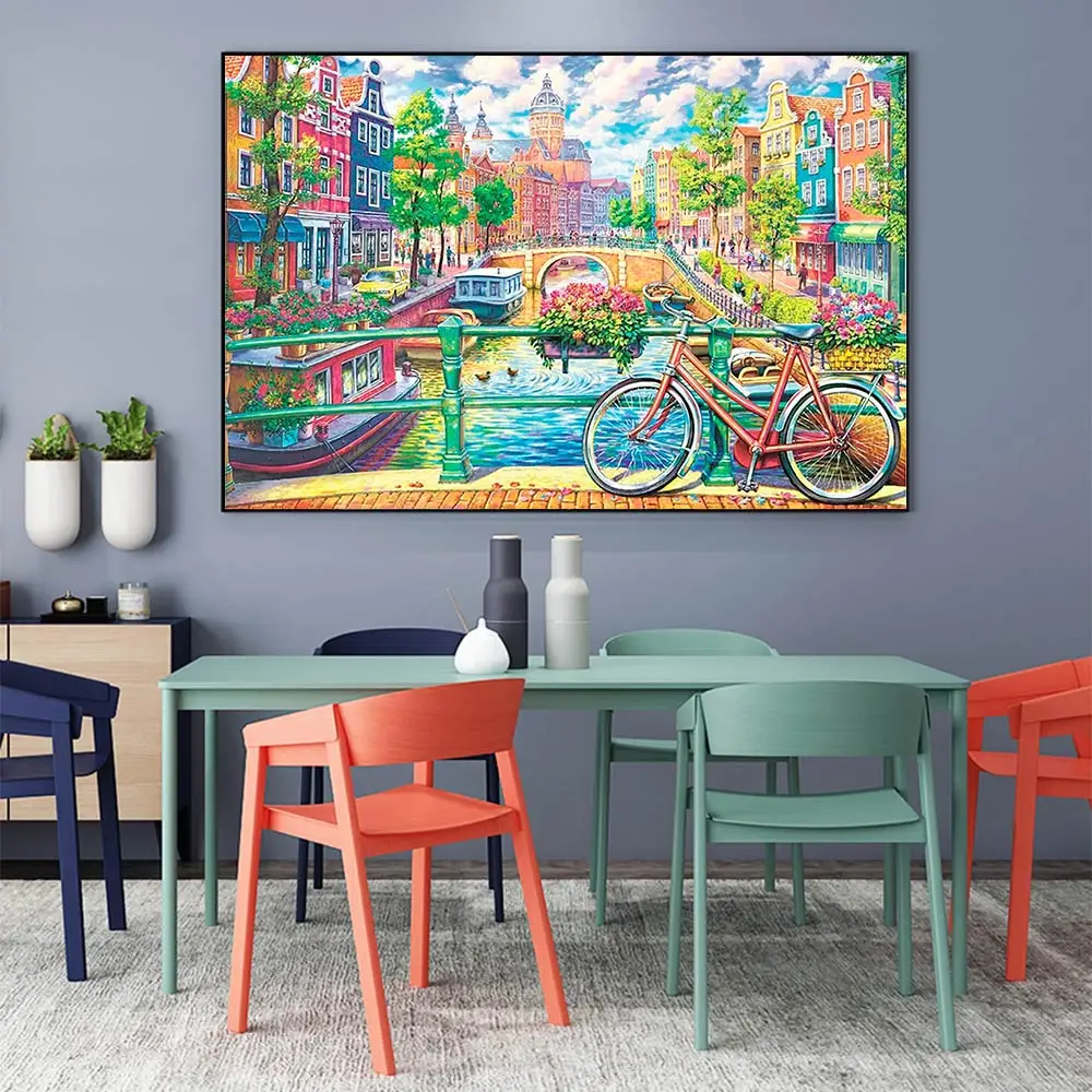 Городской мост канал пейзаж, картина, выложенная алмазами Круглая Полная дрель DIY мозаика вышивка 5D крестиком конструкция сценический узор