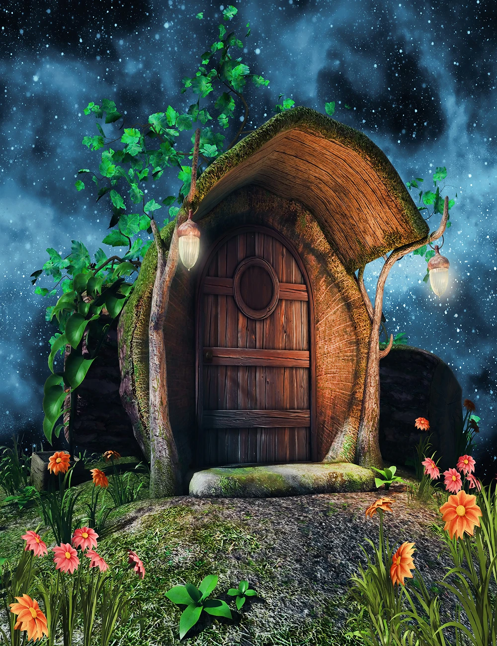 Фон для студийной фотосъемки с изображением сказочного деревянного дома леса сказочного пейзажа