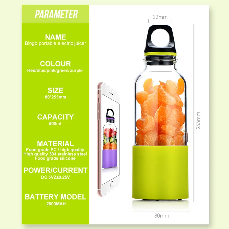 Особенности: 1. Зарядка через USB, легко заряжать в любом месте. 2. Можно заряжать с помощью внешнего аккумулятора, ПК, ноутбука, автомобильного USB и т. д. 3. Специальная конструкция в форме бутылки, которую легко носить с собой на выход. 4. Удобная бутылка и соковыжималка 2-в-1. 5. Приготовление протеинового коктейля, смузи, сока. 6. Также хорошо подходит для овощей и других детских блюд. Описание: 1. Подходит для занятий спортом и путешествий. 2. Можно использовать как обычную бутылку и блендер для сока. 3. Каждый день Пейте протеиновый коктейль, смузи или здоровый напиток. Характеристики: Материал: Поликарбонат + нержавеющая сталь 304 + пищевой силикон Цвет: красный, фиолетовый, зеленый, синий, розовый, оранжевый Размер изделия: 80*255 мм Емкость: 500 мл Мощность/ток: 5 В ± 0,25 В постоянного тока Емкость аккумулятора: 2600 мАч Посылка 1 х соковыжималка 1 x USB-кабель для зарядки 1 х Руководство пользователя Примечания: 1. Из-за разницы между различными мониторами изображение может не отражать реальный цвет изделия. Мы гарантируем, что модель реального изделия не отличается от представленной на фото. 2. Из-за различных методов измерения может быть погрешность в 1-3 см. Спасибо!