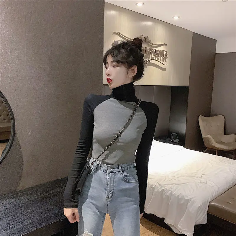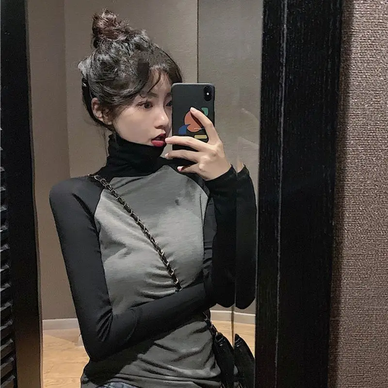 Женские футболки, Женский облегающий Топ контрастных цветов с высоким воротником и длинным рукавом, облегающая футболка, укороченный топ, женские футболки