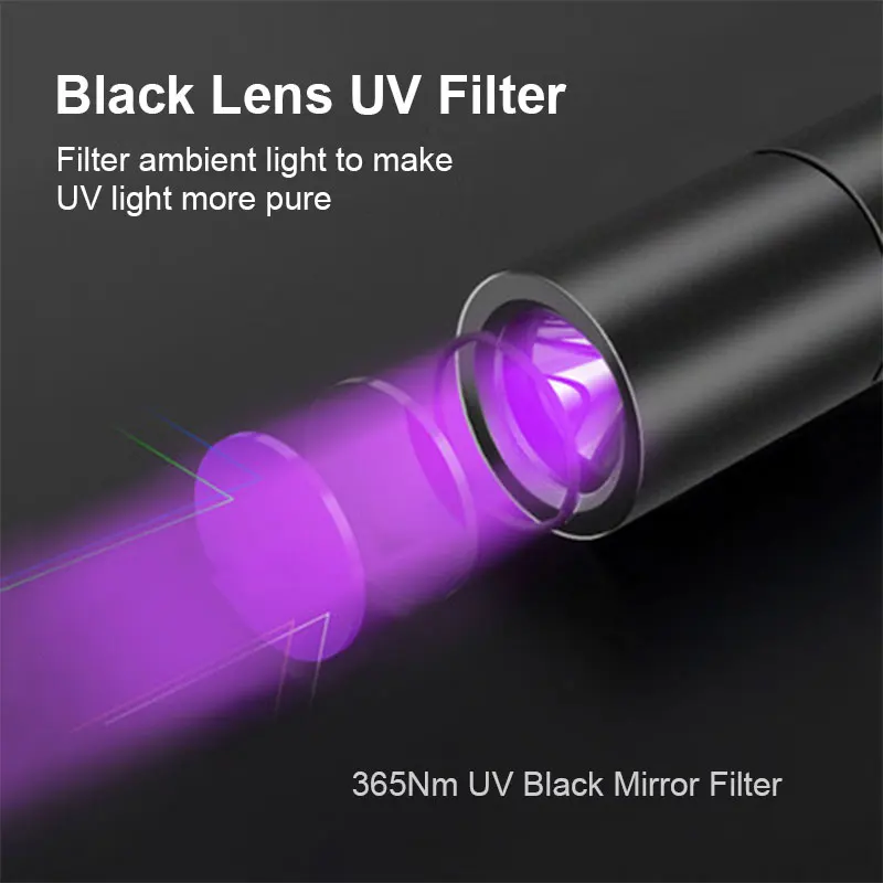 Инструкция-USB Перезаряжаемый 365нм УФ-фонарик с черным фильтром-Использование: охота на скорпионов, детектор мочи домашних животных, проверка денег, водяных знаков, драгоценных камней и т. д.-Популяризация знаний: 365NM вспышка светильник ультрафиолетовый светильник-s светильник ly белый, и он обладает более высокой разрешающей способностью в ночное время или в специальных сцен, таких как обнаружения банкнот, драгоценные камни, изумруды и специальные люминесцентные лампыХарактеристики:-Материал: алюминиевый сплав-Размеры: 12,5*2,5 см; Вес: 100 г-Светодиодный источник: 365нм УФ-светодиодный-Максимальная мощность (W): 3 Вт-Диапазон освещения: 20-30 метров-Тип батареи: встроенный аккумулятор 18650-Время освещения: 2-3 часа-Посылка: фонарик, usb-кабель и белая коробкаОсобенности:【Black lens】оснащен жестким упрочненным черным фильтром, оптическим объективом, который может фильтровать посторонний светильник из окружающей среды, очень маленький Видимый светильник, что делает ультрафиолетовый светильник более чистым【Прочный и долговечный 】 корпус изготовлен из высококачественного алюминиевого сплава, что значительно улучшает его теплоотдачу и долговечность, что делает фонарик более надежным и долговечным.