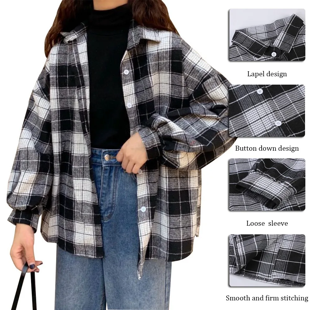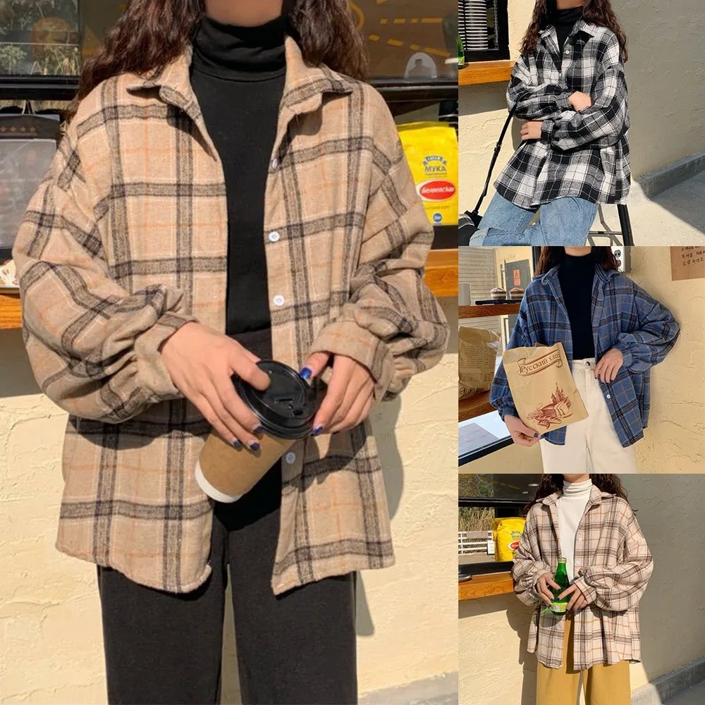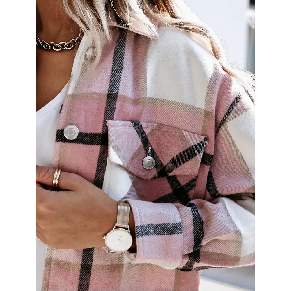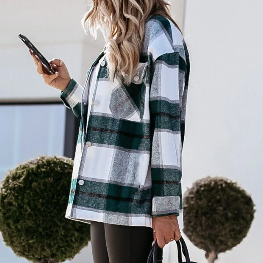 Зимняя зеленая клетчатая куртка, женская уличная одежда, длинное пальто, модная Осенняя рубашка большого размера с карманами и отворотом, верхняя одежда