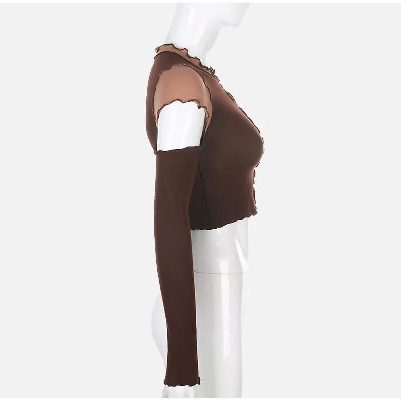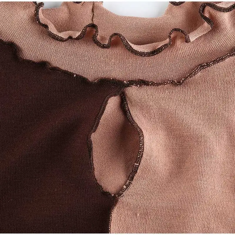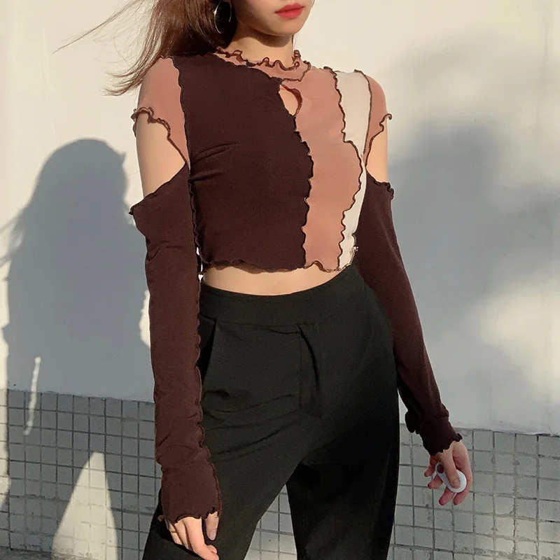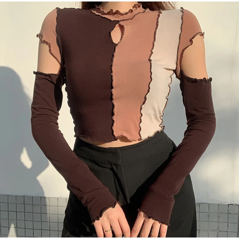 Женская футболка с оборками и вырезами, укороченный топ с длинным рукавом в стиле пэчворк, весна-осень 2021, уличная одежда, повседневная женская футболка