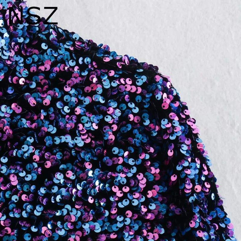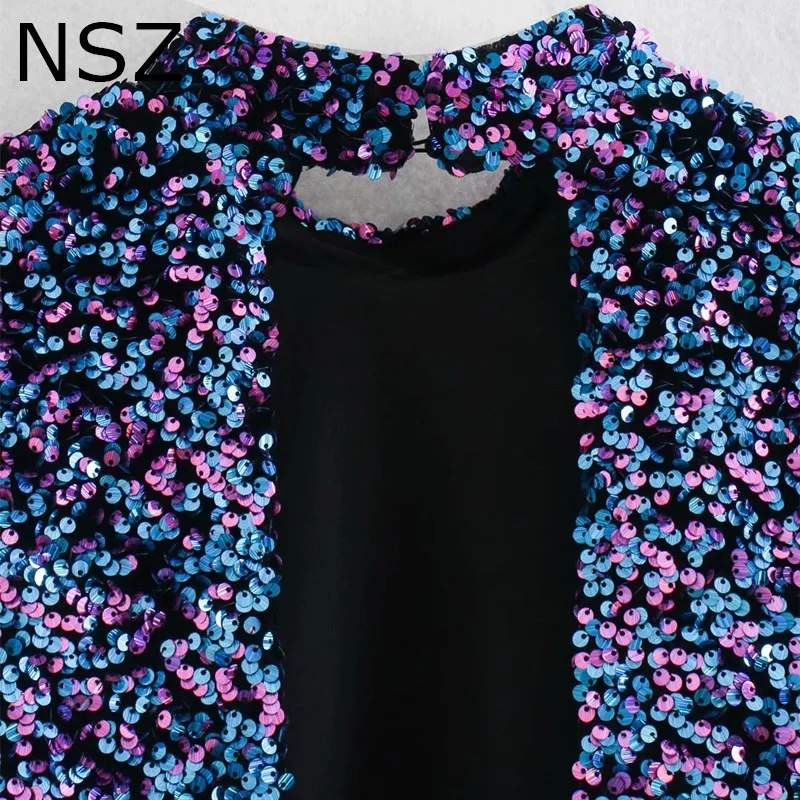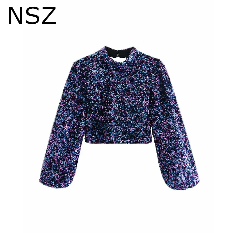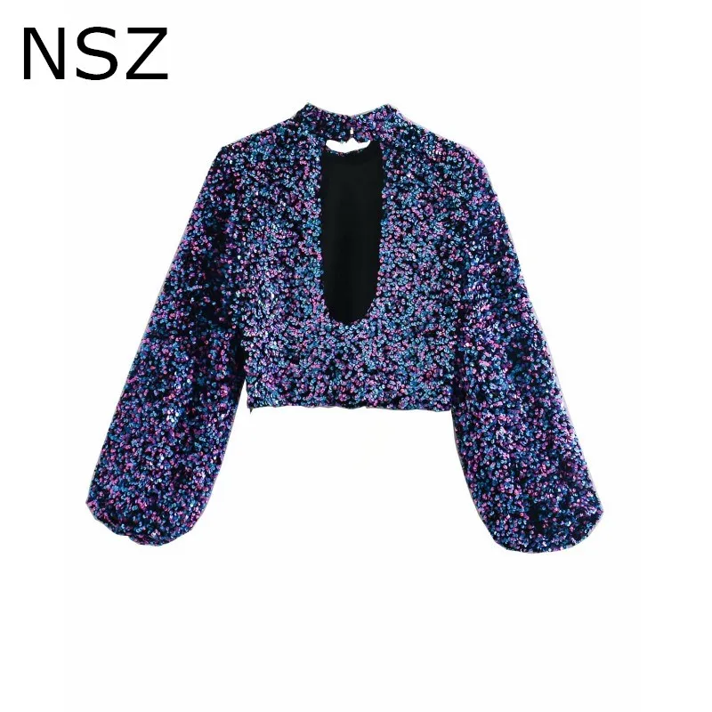NSZ Женская пайетки джемпер Блестящий Яркий укороченный топ с открытой спиной для ночного клуба, пикантные, с вырезами Вечерние Рубашка Модный новогодний Клубная одежда Топ