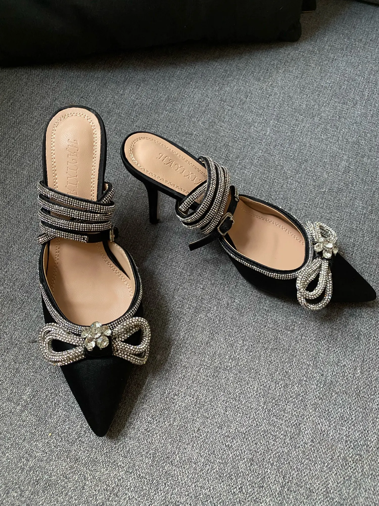 Женские блестящие туфли-лодочки в подиумном стиле со стразами и бантом, атласные однотонные кожаные туфли-лодочки на высоком каблуке для вечевечерние и выпускного