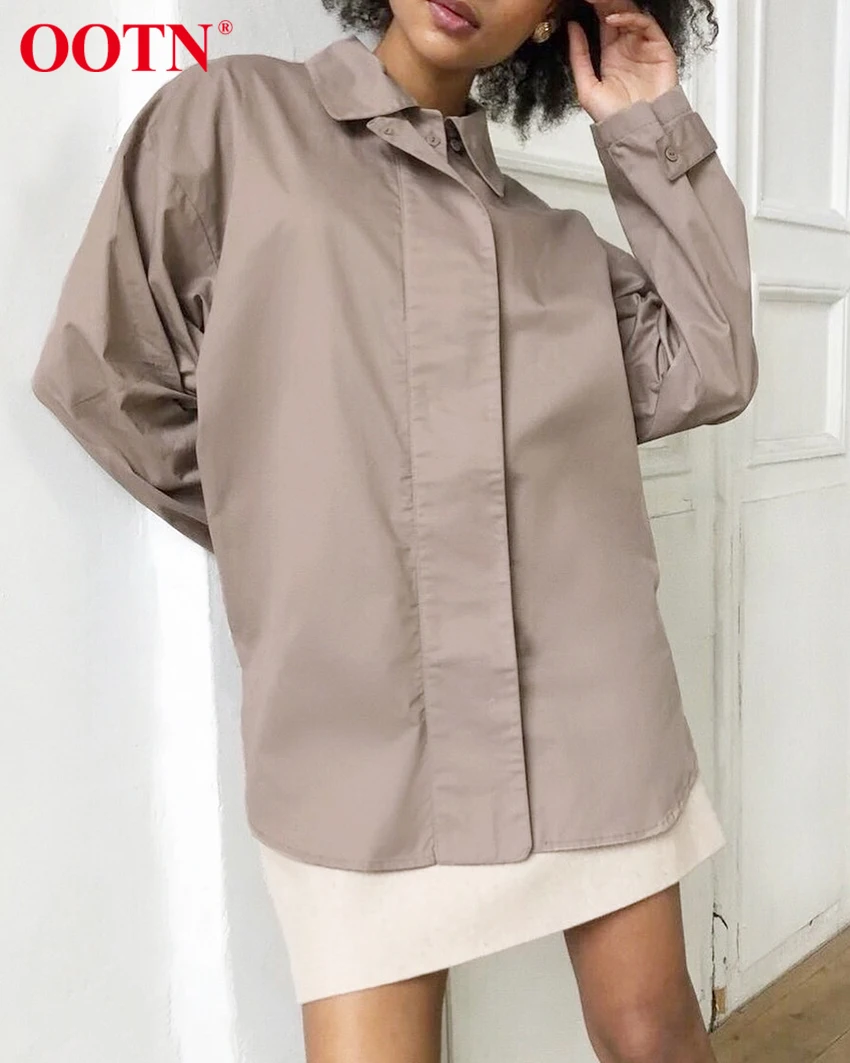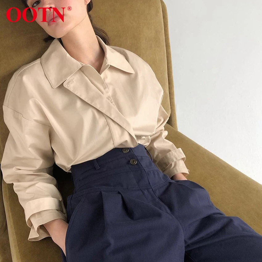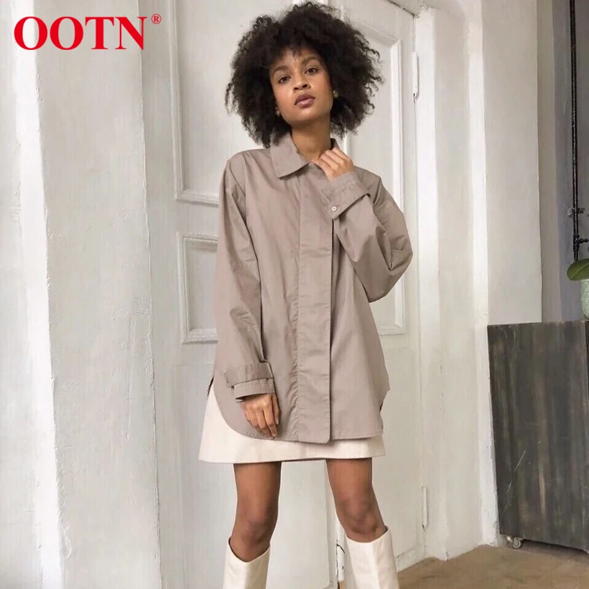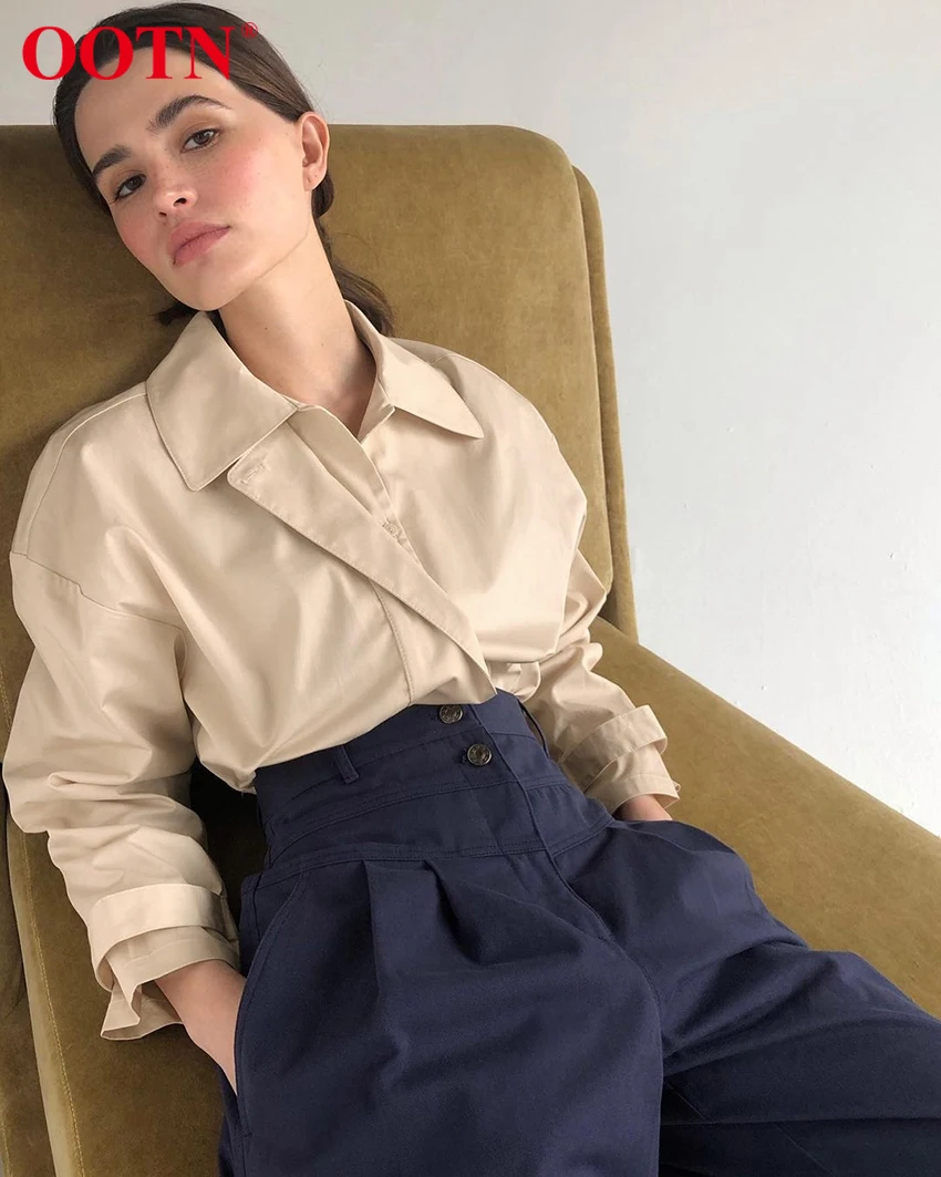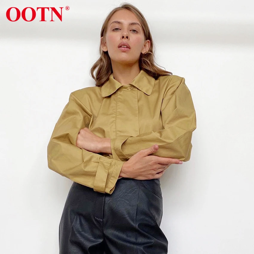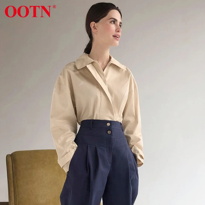 Женская офисная блузка с длинным рукавом OOTN, повседневная Однотонная рубашка цвета хаки с отложным воротником, весна 2021