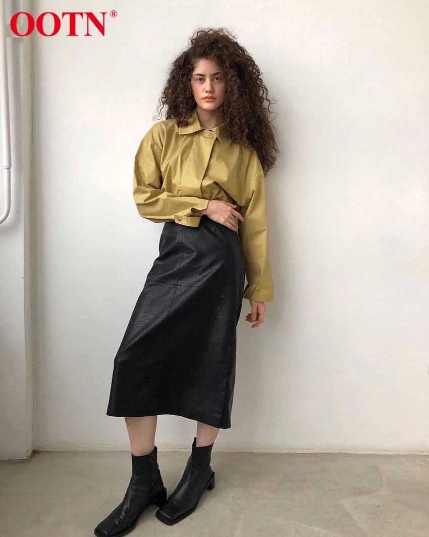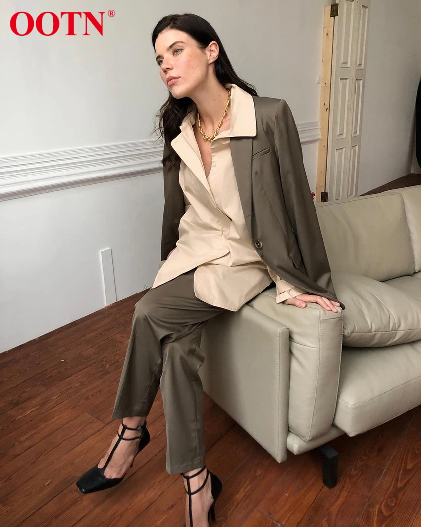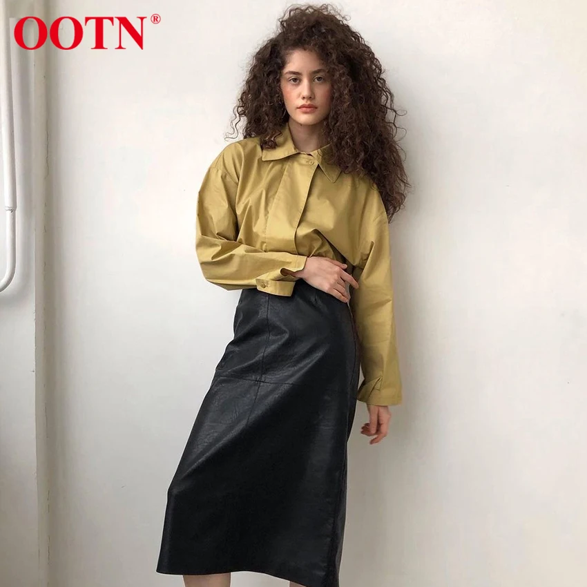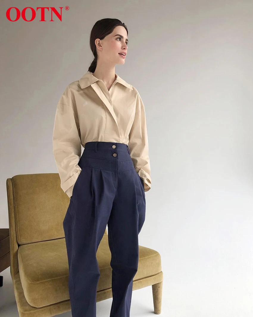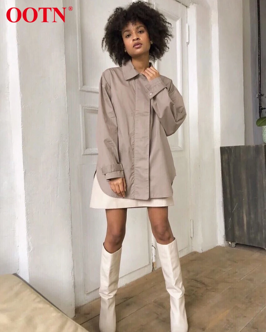 Женская офисная блузка с длинным рукавом OOTN, повседневная Однотонная рубашка цвета хаки с отложным воротником, весна 2021