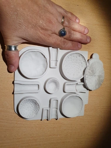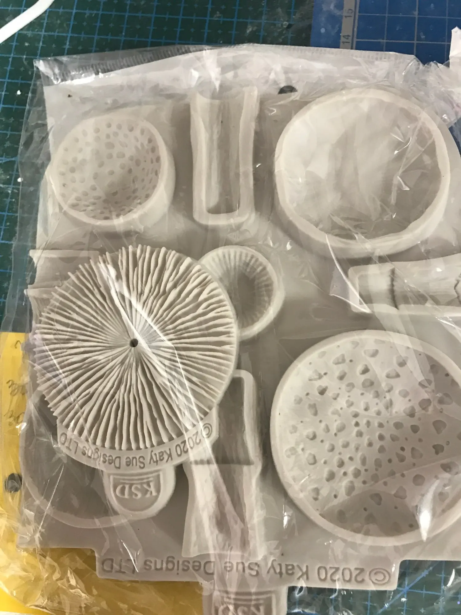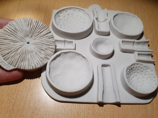 Шикарный молд! Точно прорисованы детали и мухоморов и других грибочков! Несколько видов ножек в половинном виде. С продавцом не общалась.