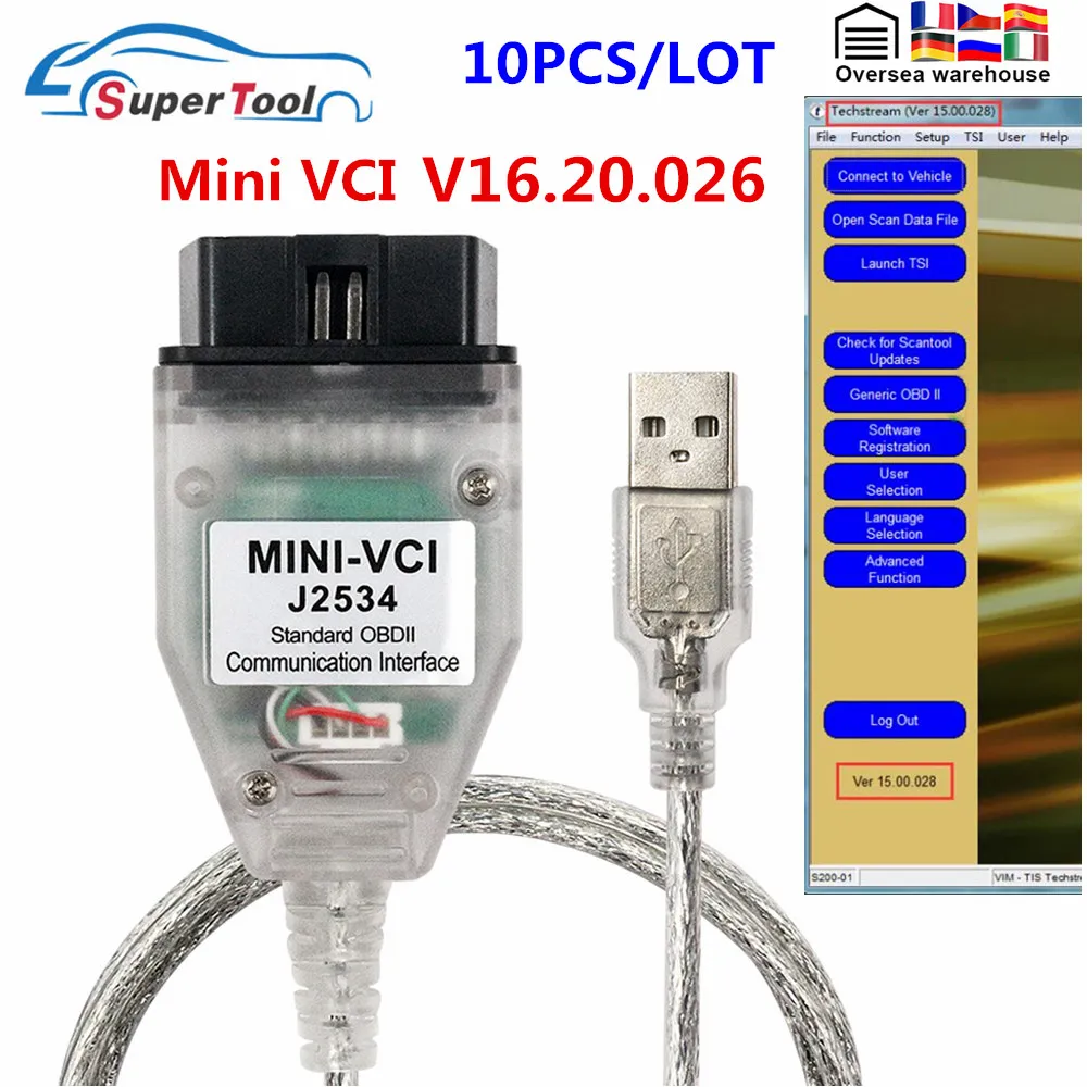 Автомобильный диагностический интерфейс Mini VCI V16.20.026 для TOYOTA OBD2, автомобильный соединительный кабель Mini VCI J2534 FT232RL TIS Techstream, 10 шт.