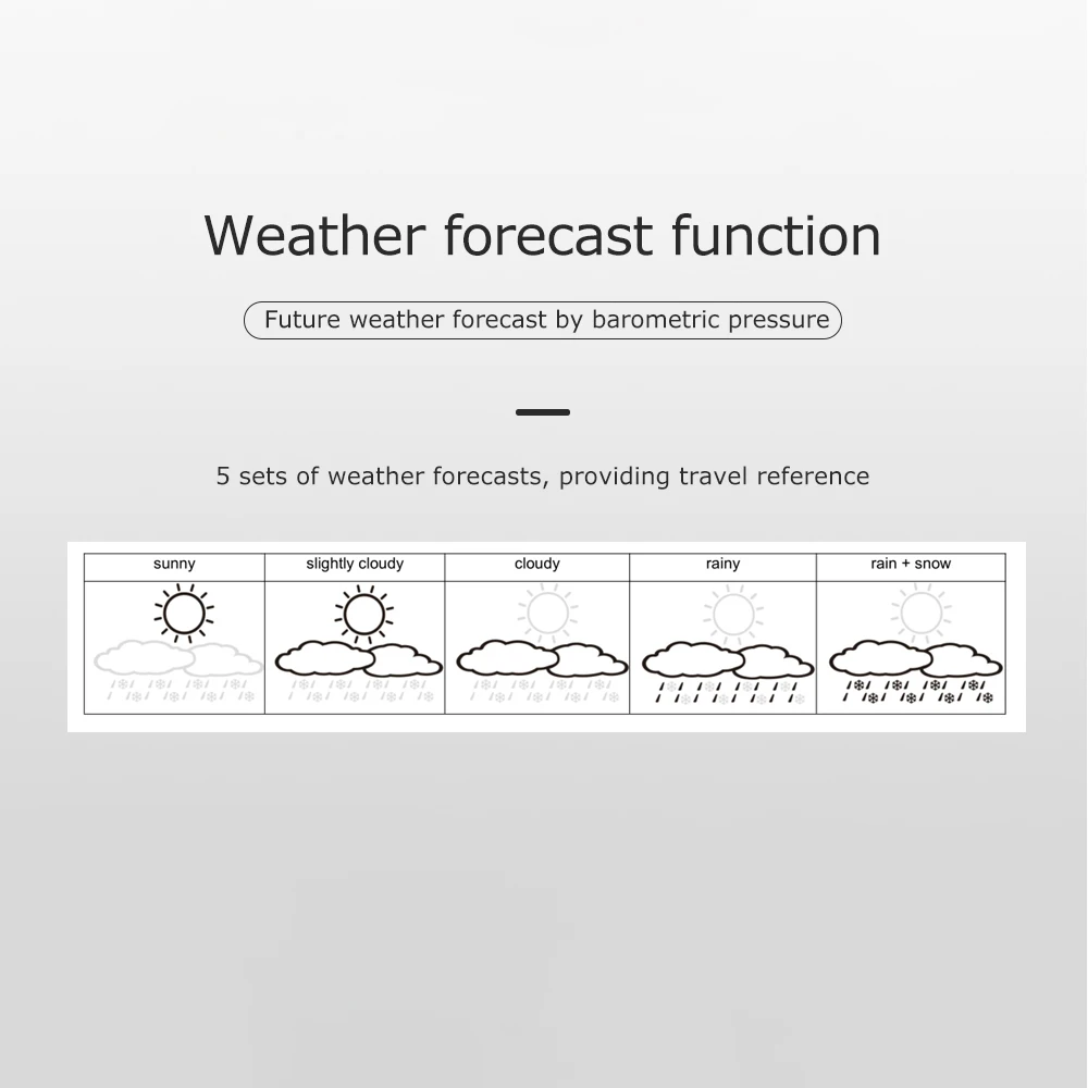 Предоставляет пять видов прогнозов погоды по данным о давлении воздуха, включая солнечную, слегка облачную, облачную, дождливую, дождливую и снеговую, заботясь о своем теле.
