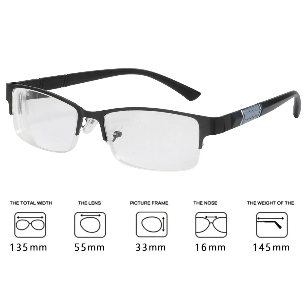 Тип: металлические очки для близорукости Цвет: черный, синий, серый Материал: смола, металл Прочность: 0/100/150/200/250/300/350/400/450/500/550/600 Пол: женщин, мужчин Стиль: Модный, винтажный Длина оправы: 135 мм Ширина линз: 55 см Высота линз: 33 мм Длина ножек очков: 145 мм Изготовлен из высококачественного полимерного материала, он очень прочный. Модные ручки обеспечивают гладкость и комфорт. Они подходят для мужчин и женщин. Посылка включает в себя: 1 Металлические Очки для близорукости