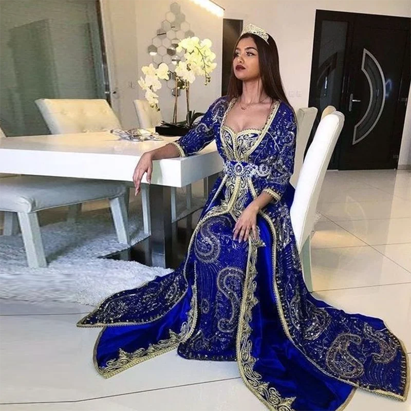 Роскошный синий марокканский кафтан вечернее платье с длинным рукавом Дубай женское вечернее платье на заказ большие размеры арабское вышитое бисером платье для выпускного вечера