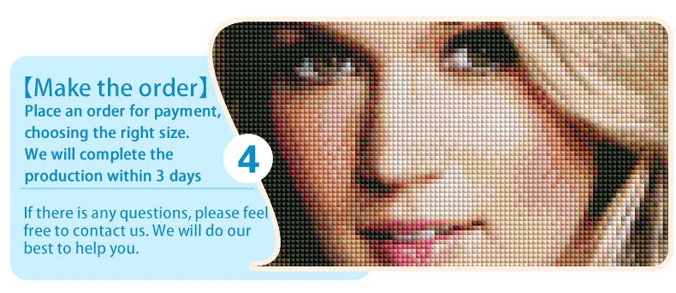 1. 【Выберите фотографию 】 Выберите свою любимую фотографию в альбоме телефона.2. 【Отправьте фото 】 свяжитесь с нами, отправьте нам выбранную вами картинку и сообщите нам размер.3. 【Посмотрите на эффективность 】после отправки фотографии, служба поддержки клиентов покажет вам эффект фото дизайна.4. 【Сделайте заказ 】 разместите заказ для оплаты, выбрав правильный размер. Мы завершим производство в течение 3 дней.