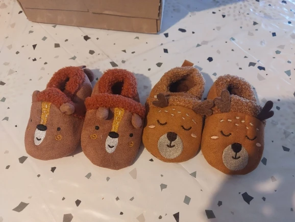 Всё как на фото. Цвет немного темнее. Брали оленя. Внутри резиночки крепко фиксируются на ножке не сваливаются. Пришло за 2 недели в тверскую область. Размер соответствует заявленному., но стоит учитывать что каждый ребёнок индивидуальный. Качество неплохое и вполне стоит своих денег. На прохладном осень в коляску подойдут. Потому что у нас Россия всё таки и это не валенки а тапки. Скажем так для дома в деревне зимой супер..правда подошва скользит по ламинату, ленолеуму, крашеному полу.