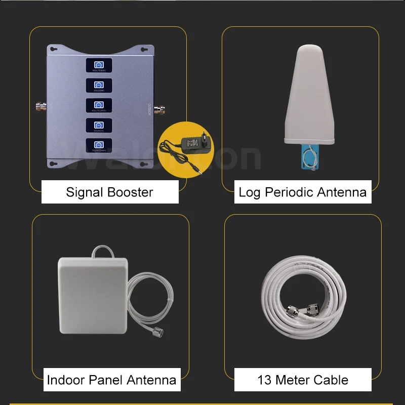 1,800 900 1800 2100 2600 пятидиапазонный усилитель 2. Наружная антенна 3. Внутренняя антенна 4. Кабель 13 метров 5. Вилка питания.