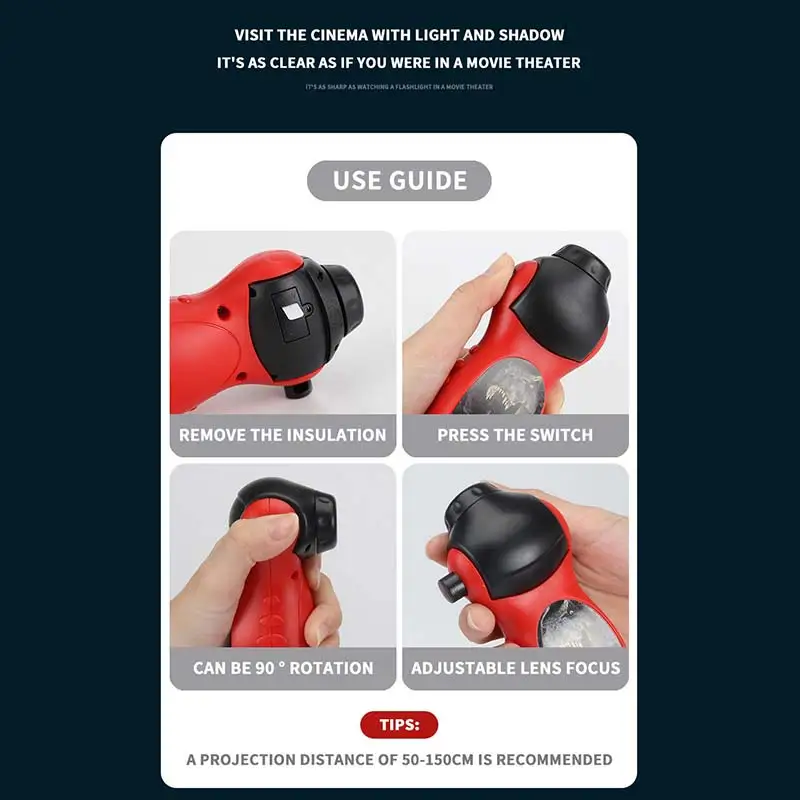 3. Он может быть проецирован на стены или потолки в темноте. Разумное расстояние проекции составляет около 50-150 см, вращается для регулировки определения.