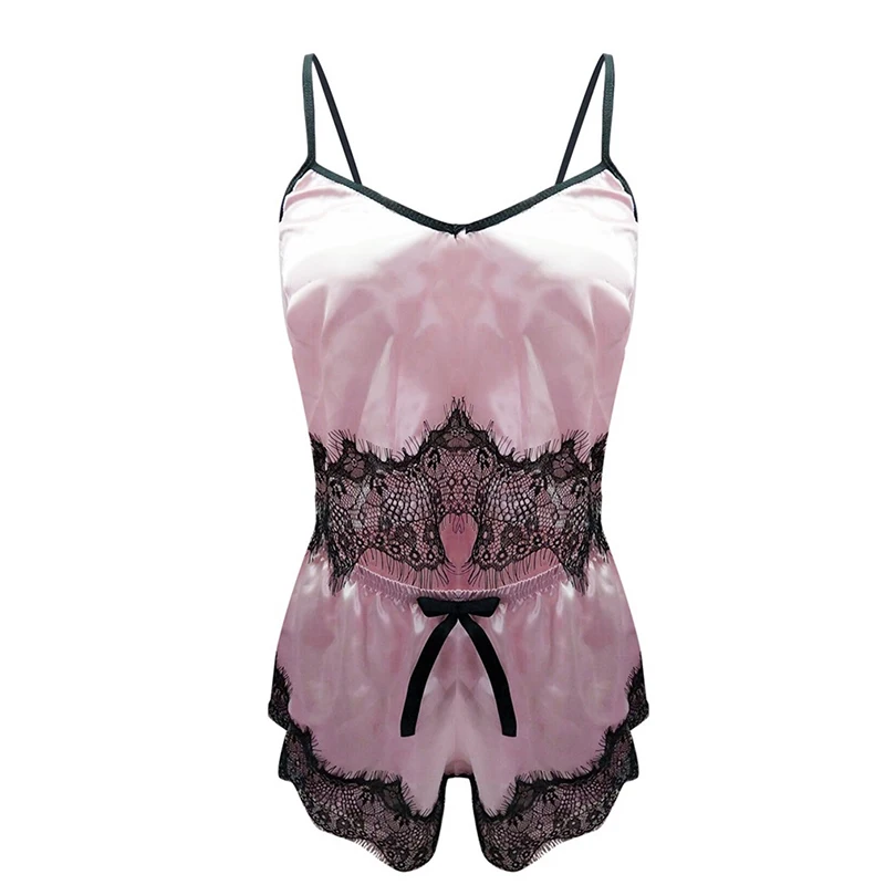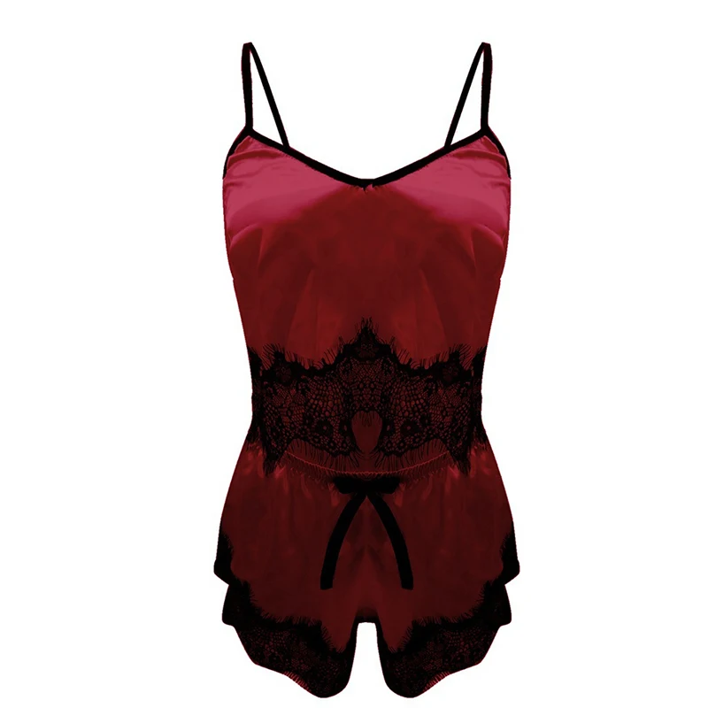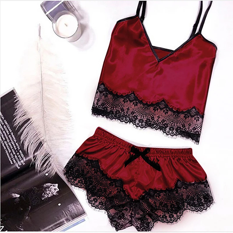 Пижама женская, атласная, кружевная, с V-образным вырезом