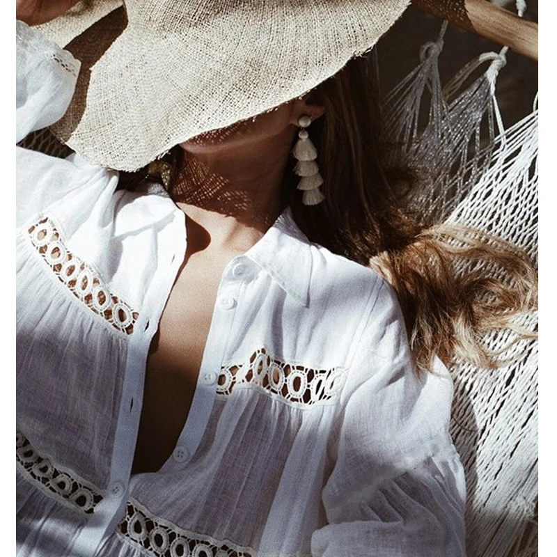 Купальник женский кружевной, вязаный крючком однотонный пляжный накидка, пикантный длинный рукав-труба, бикини, пляжная одежда, Пляжное платье, на лето
