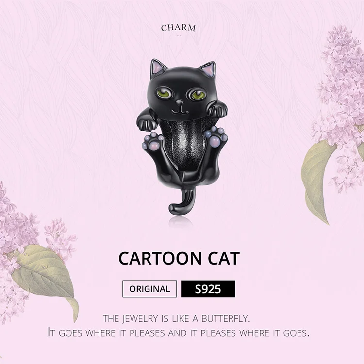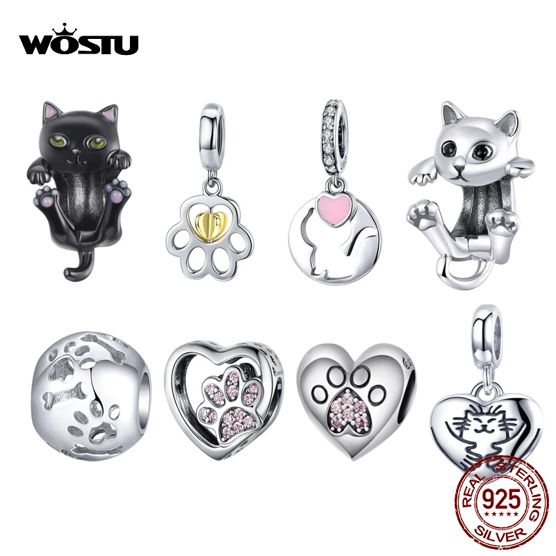 Подвеска из серебра 925 пробы с изображением кота из мультфильма Wostu, бусина "Кошка", шармы в форме следа ноги подходят для оригинальных браслетов, ювелирные изделия из серебра с цирконием