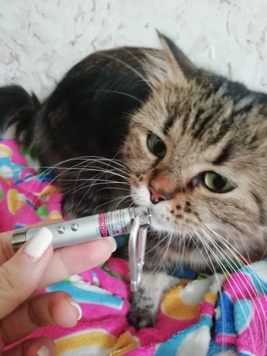 пришла с батарейками, кот быстро устал, светит хорошо, три режима