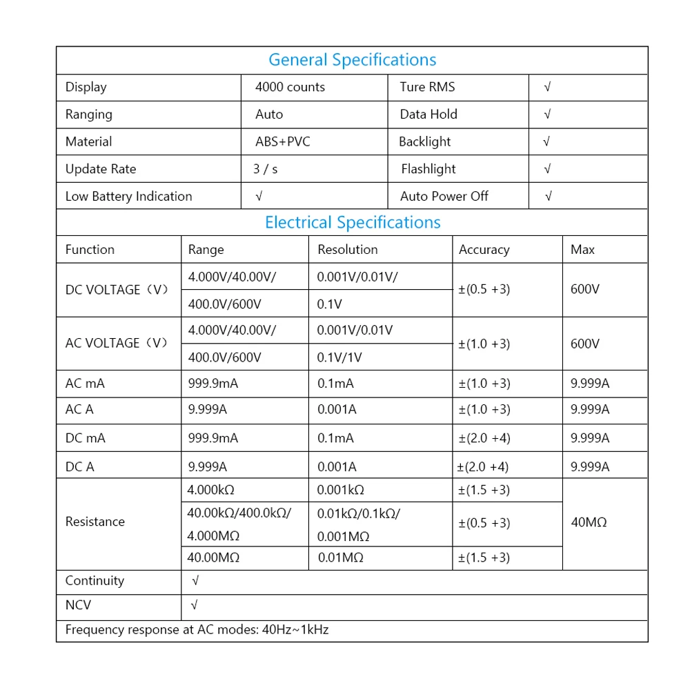 Этот мультитестер используется для измерения напряжения переменного/постоянного тока, переменного/постоянного тока, сопротивления, NCV, диода, непрерывности. Автоматическое отключение питания, низкое энергопотребление. Это идеальный инструмент для лаборатории, фабрики и дома. Особенности:Многофункциональный, может измерять напряжение переменного/постоянного тока, переменного/постоянного тока, сопротивление, NCV, диод, непрерывность.Функция измерения в одно касание с автоматическим идентификационным устройством, проста в использовании.Портативный дизайн карманного размера, легко носить с собой в помещении и на улице.Стабильная производительность, высокая точность, TRMS, большой ЖК-экран.С функцией хранения данных, удобно считывать результаты измерений.Большой светодиодный дисплей поддерживает подсветку, легко читается даже в темных местах.Защитный чехол из ПВХ, прочный и износостойкий, защитит его от пыли и падения.Это идеальный инструмент для лаборатории, фабрики и дома. Характеристики:Номер модели: RM403BРабочая температура: 0 - 40 ℃Рабочая влажность: ≤ 75% RHУсловия хранения: -20 ~ 60 ℃Влажность при хранении: ≤ 80% RHРежим работы: автоматическийДиапазон напряжения постоянного тока: 4 в/40 В/400 В/600 ВДиапазон напряжения переменного тока: 4 в/40 В/400 В/600 ВДиапазон переменного тока: 999.9 мА/9.99AДиапазон постоянного тока: 999 .9 мА/9.99AДиапазон измерения сопротивления: 4k/40k/400K/4M/40M ОмЧастота выборки: 3 раза в секундуПитание: 2*1,5 в батарейки типа ААА (Не включено)Вес изделия: 117 г/4,13 унцийВес посылка: 169 г/5,96 унцийРазмер товара: 118*60*25 мм/4,65*2,36 * 0.98inПосылка: 190*140*35 мм/7,48*5,51 * 1.38in Примечание:Измерение должно производиться с правильными входными клеммами и функциями и в допустимом диапазоне измерений.Не используйте продукт вокруг взрывоопасного газа, пара или во влажной или влажной среде.Низкий уровень заряда батареи приведет к неправильному считыванию. Меняйте батарейки при низком уровне заряда батареи. Не делайте измерения, когда дверца аккумулятора не находится в нужном положении.Не входите в напряжение, превышающее 36 В постоянного тока или 25 В переменного тока, когда вы находитесь на месте, где происходит Измерение тока.Пожалуйста, учитывайте 1-3 дюйма сантиметра из-за ручного измерения. Комплектация:1 * Цифровой мультиметр1 * Тестовые провода1 * Руководство пользователя на английском языке