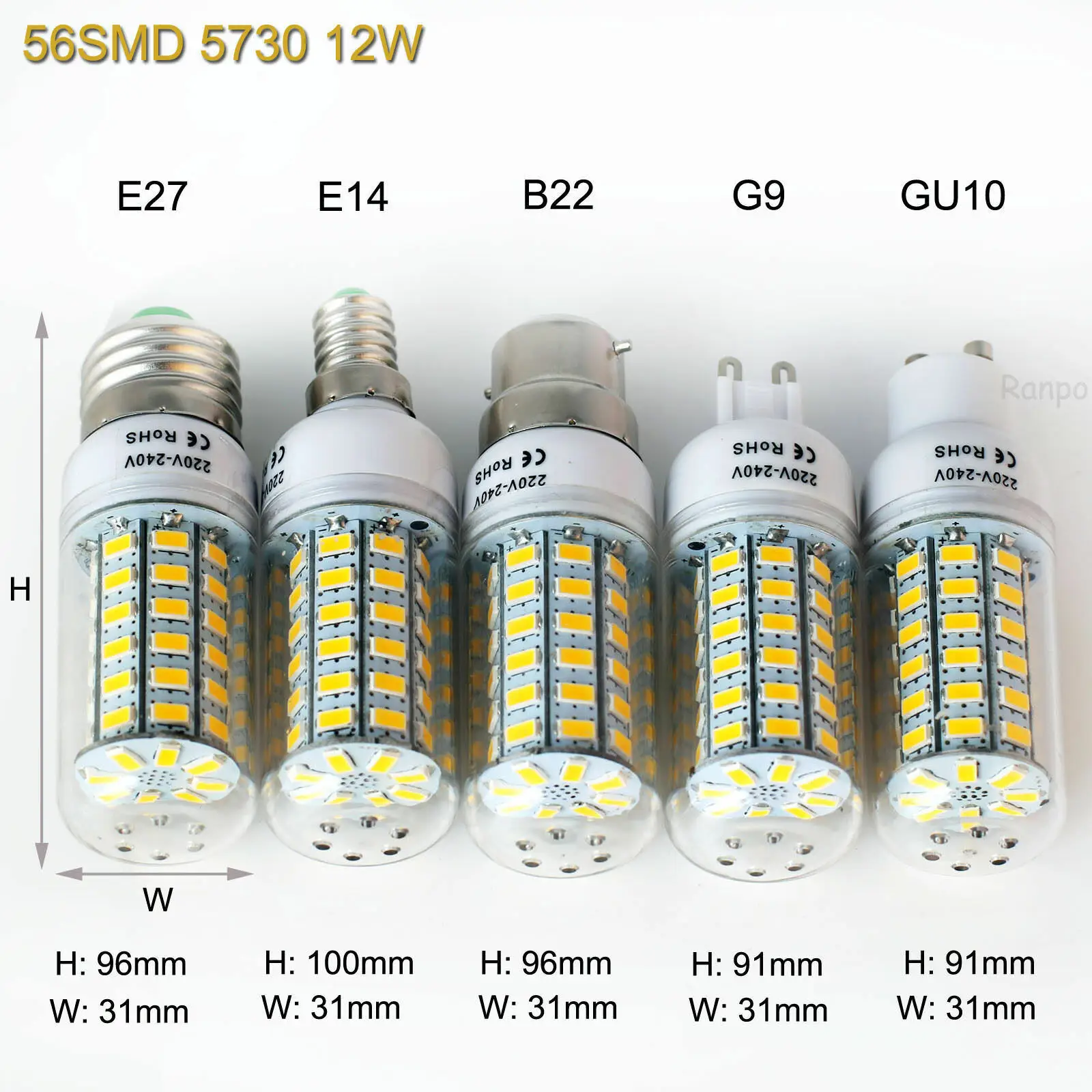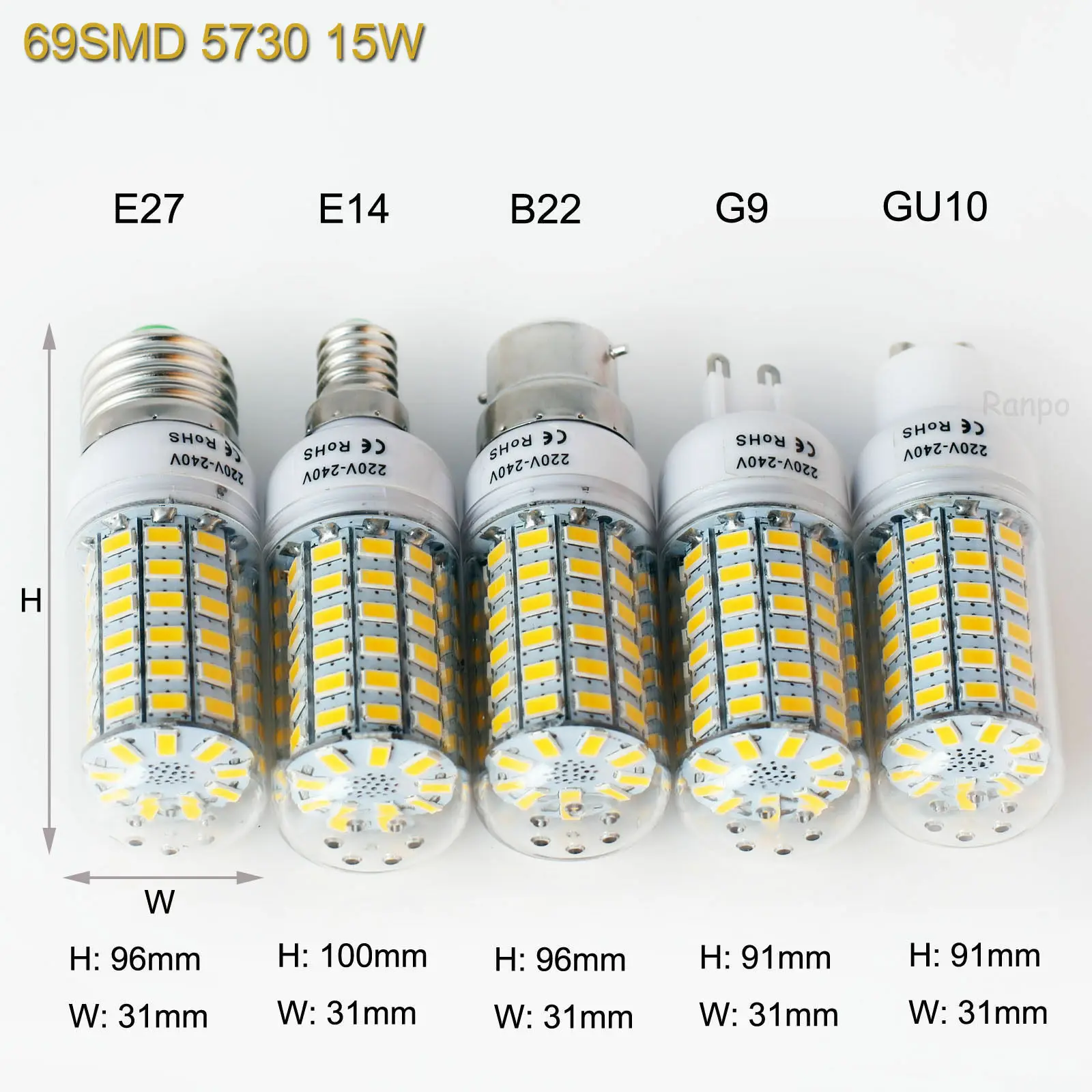 Модель: светодиодный светильникТип цоколя: E27 E14 G9 GU10 B22Тип SMD: 5730 SMDКоличество СВЕТОДИОДНЫЙ: 24 шт./36 шт./48 шт./56 шт./69 шт./108 шт.Цветовая температура: 6000-6500K (Холодный/дневной белый); 2700-3200K (теплый белый); 4000-4500K (нейтральный белый)Диммируемая или нет: не диммируемаяНапряжение: 220 В переменного токаРабочая температура: от-20 ℃ до 60 ℃Угол луча: 360 градусовСертификация: CE & RoHSСрок службы: более 50 000 часовГарантия: 3 года