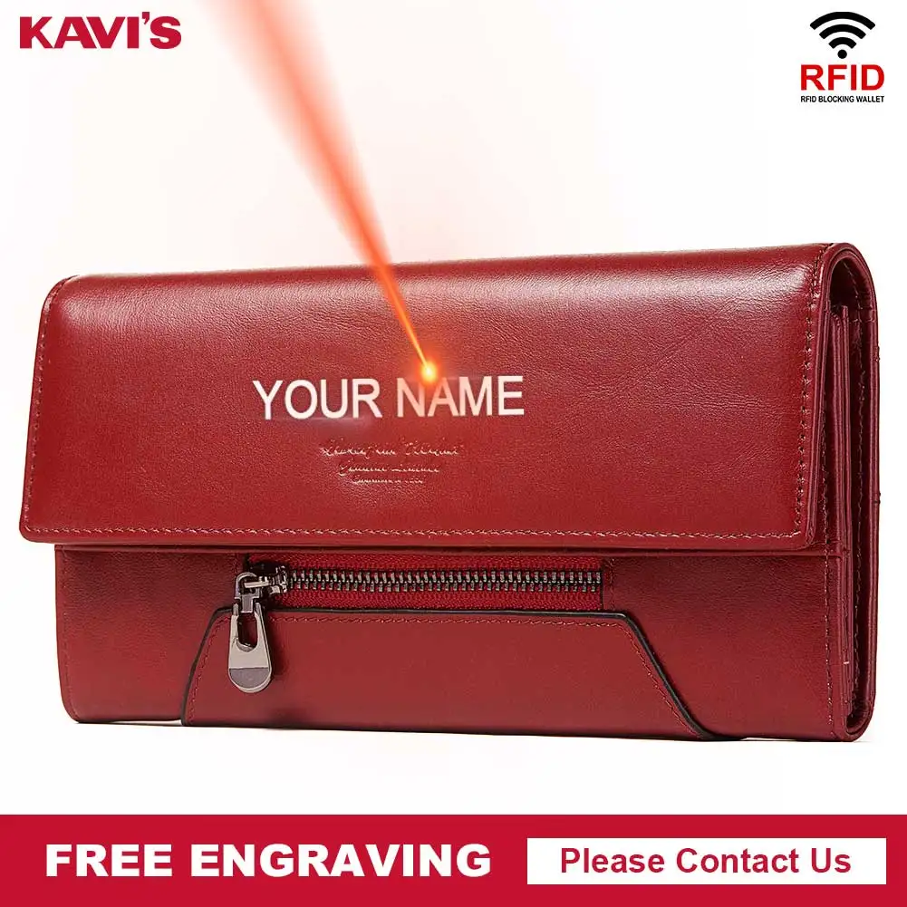 Женский кожаный кошелек KAVIS, Дамский кошелек для мелочи, портмоне на застежке, клатч, сумка для денег, держатель для карт, длинный удобный, Бесплатная гравировка