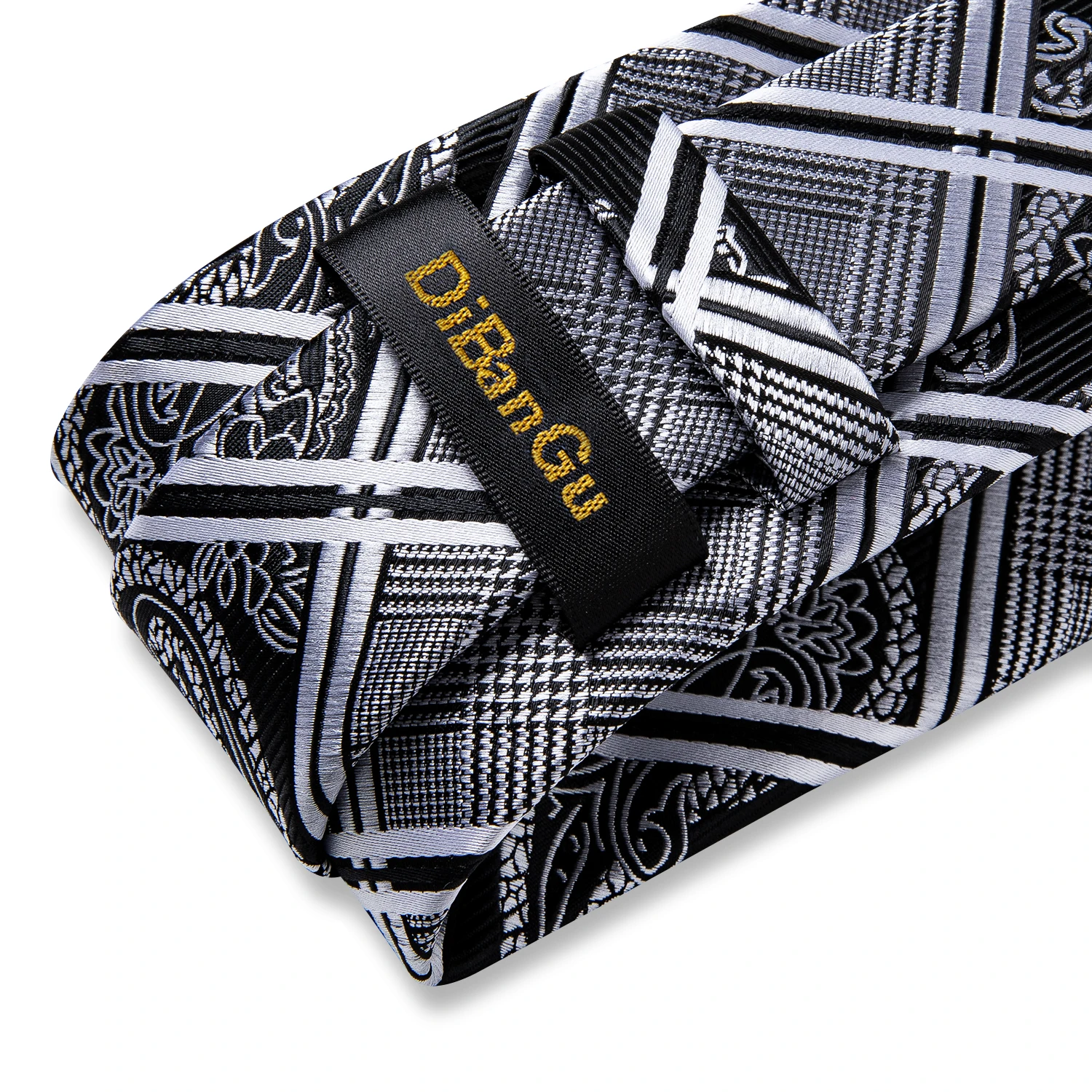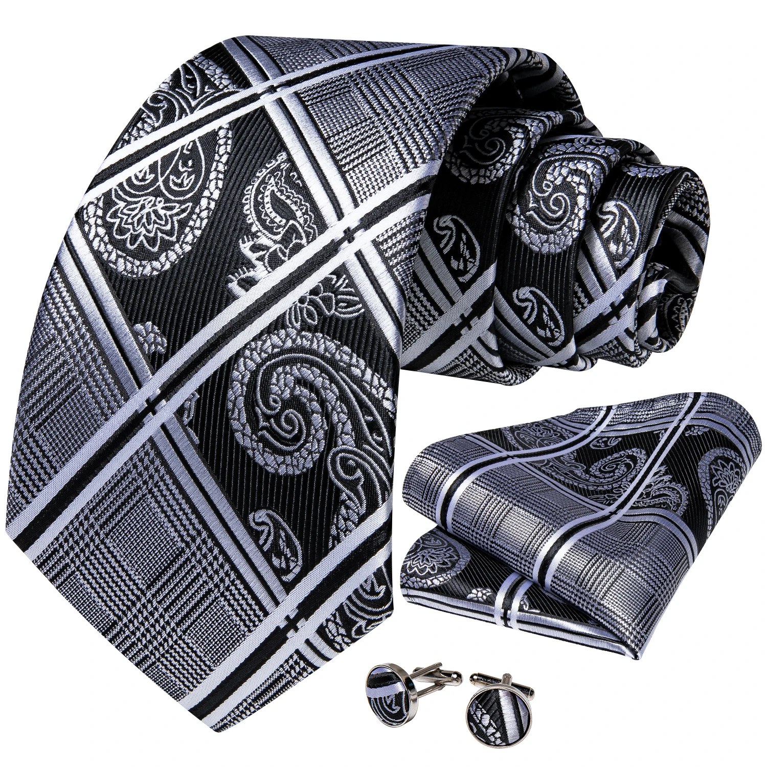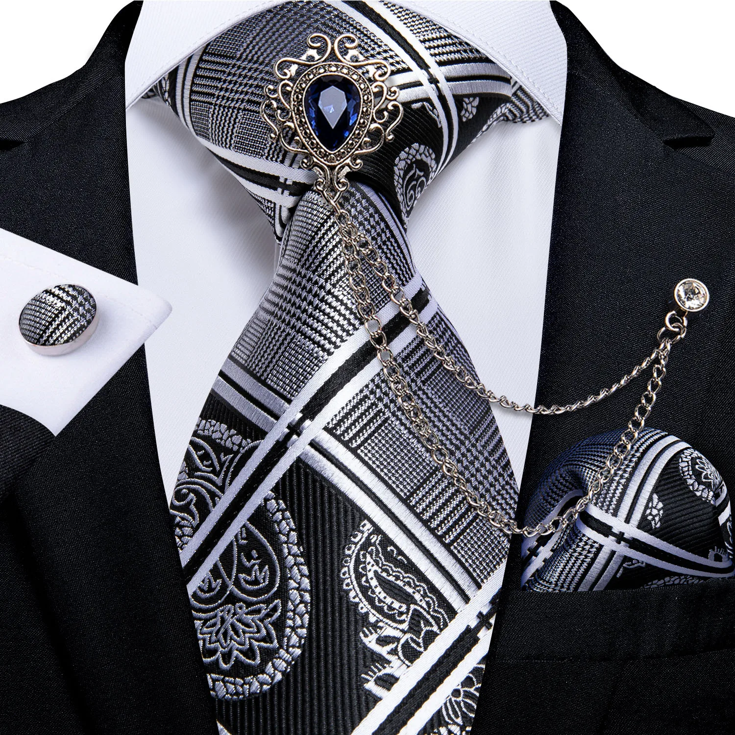 Черный и серебряный цветочный Галстук Пейсли для мужчин 8 см деловой Свадебный галстук носовой платок с роскошной брошью с кристаллами DiBanGu