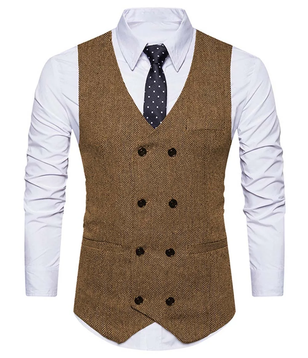 Твидовый мужской костюм, жилет с V-образным вырезом, приталенный силуэт в елочку, зеленыйчерныйкоричневый, деловой двубортный жилет, шафера, свадебный жилет