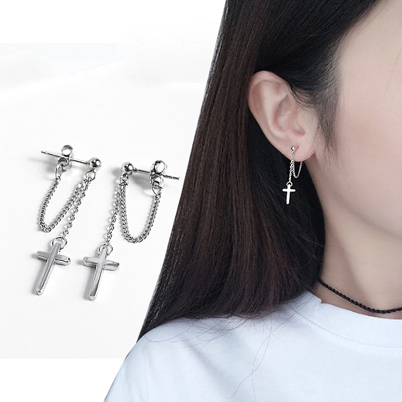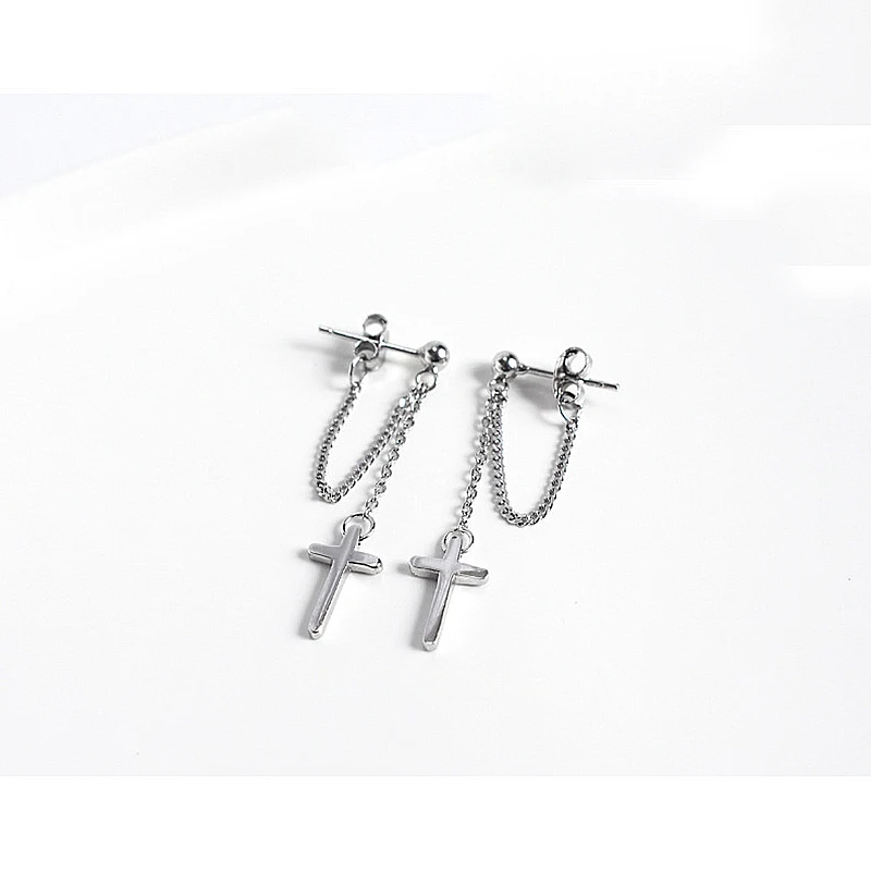 Серьги-гвоздики женские, серебристого цвета, с маленьким крестом