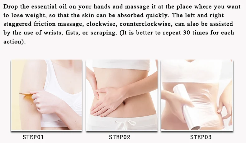 Поместите эфирное масло на руки и массируйте его в том месте, где вы хотите похудеть, чтобы кожа быстро впитывалась. Массаж трения слева и справа, по часовой стрелке, против часовой стрелки, также может быть использован при помощи запястья, Кулаков или соскабливания. (Лучше повторять 30 раз для каждого действия).