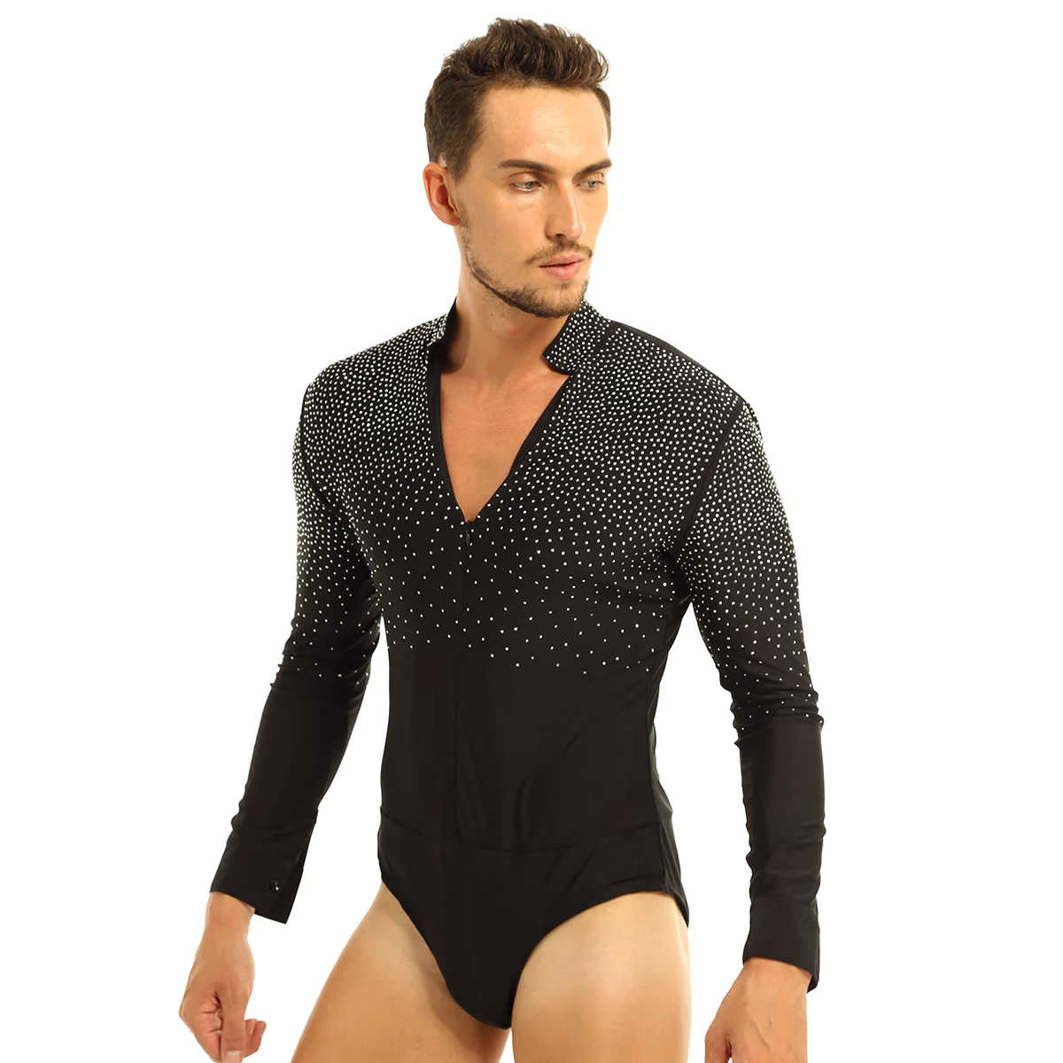 Особенности:Мужская цельная танцевальная рубашка для бальных танцев, латинских Танго, румбы, трико, боди, рубашка, топы, хорошая эластичная ткань.Длинные рукава, v-образный вырез и воротник-стойка, лиф с блестящими стразами, потайная молния спереди, промежность с 3 пуговицами.Классический и стильный, удобный крой, а также обеспечивает большую гибкость во время танцевального движения, это лучший выбор для вашего танца.Подходит для латинских танцев, танго, румбы, дамбы, выступлений на сцене, Хэллоуина, профессиональных танцевальных соревнований и так далее.Пожалуйста, проверьте размер перед покупкой, ручная или машинная стирка в холодной воде.
