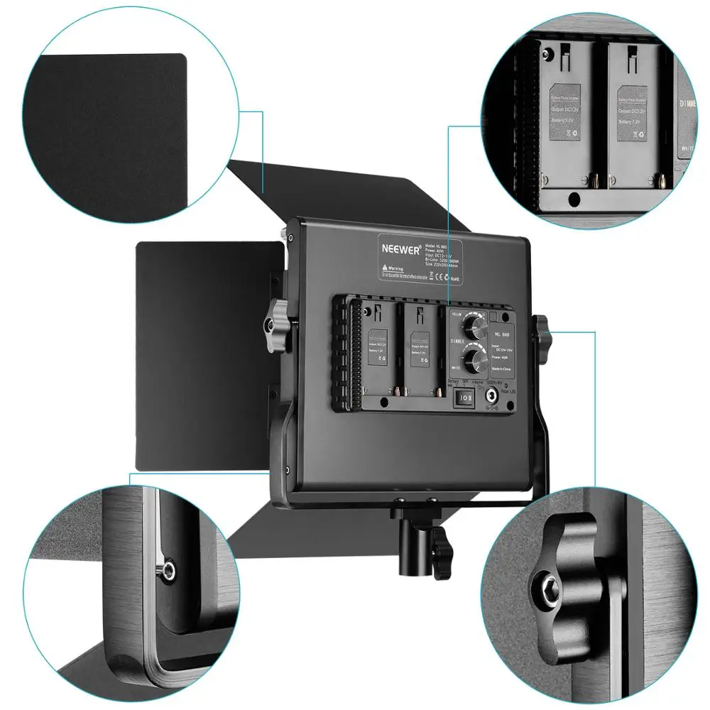 660 светодиодные лампы: с 330 белыми и 330 желтыми светодиодными лампами длительного действия, этот свет освещает переменный баланс белого от вольфрамового дневного света от 3200 до 5600K; U-образный кронштейн: позволяет фотографам регулировать угол освещения в зависимости от условий съемки