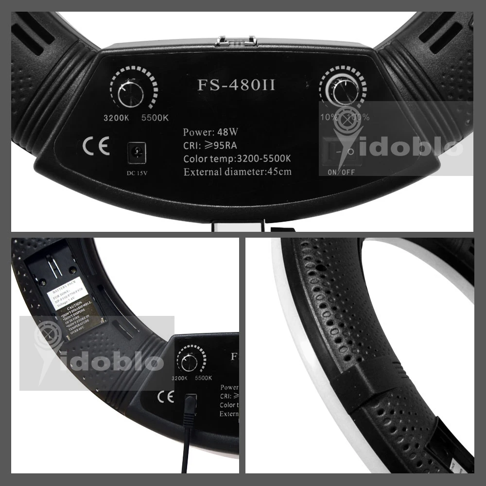 FS серия состоит из высоко яркая SMD светодиодный Чипсы, срок службы до 50000 часов. Эта серия является более эффективной и энергосберегающей, даже может достичь наименьшего уровня потери светильник. Работает с двумя Sony F750/970 батареи (14,5 V) или адаптер переменного тока (110V-220V). Регулируемая Цветовая температура от 3200-5500K. Серия FS подходит для съемки на открытом воздухе. Персонажи и свадебные фотографии, освещение для макияжа и студии.Особенности:1) светодиодный кольцевой светильник, более высокий CRI: более 95RA, затемнения 10%-100%, без мерцания2) умный и компактный дизайн, легко носить с собой3) используется высокотехнологичный импортный светодиодный фонарь с более чем 50000 часов работы.4) подходит для внутренней и наружной фотографии и видеосъемки, портретной и свадебной фотографии, интервью и т. Д. Особенно удобно для детской фотосъемки.Характеристики:Модель: FS-480Цветовая температура: 3200K-5500K ± 200KМощность: 48 Вт (480 светодиодов)Напряжение: 110-220 В переменного тока/15 В постоянного тока/два аккумулятора SONY 750/970Световой поток: 3300 Lux/0,5 m, 1000 Lux/1 мИндекс цветопередачи: 95RAСветильник угол: 60 градусов