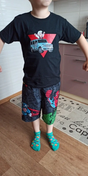 Футболки отличного качества, хлопок. Картинка после стирки целая. Брали размер 120/60 на ребёнка ростом 116-120 см, села идеально