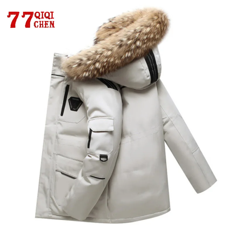 Теплая белая парка на утином пуху, мужская зимняя куртка, куртка с капюшоном и несколькими карманами, мужское повседневное пальто с меховой отделкой, мужская куртка средней длины, chaqueta
