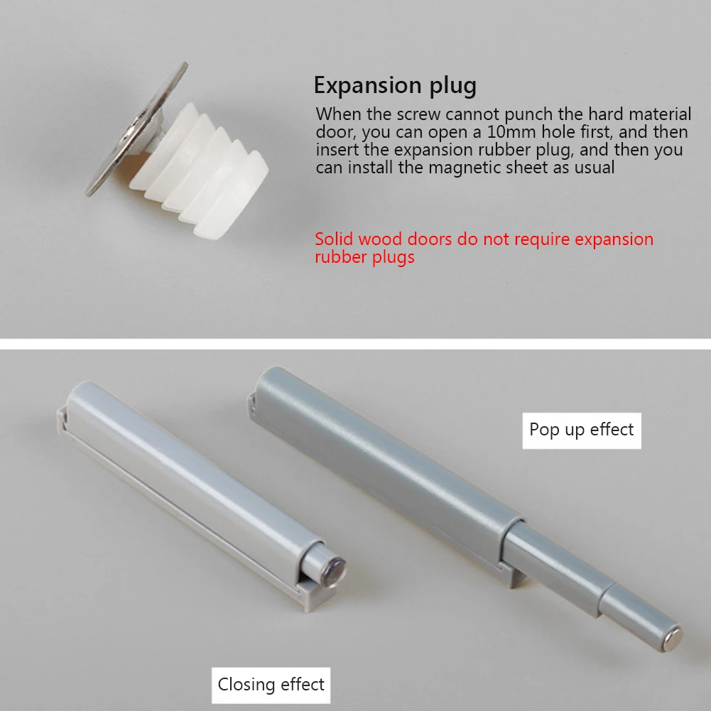 Ребаундер имеет магнитную/резиновую головку на одном конце. Магнитная головка rebounder позволяет шкафу достичь хорошего эффекта герметизации.Резиновый наконечник буфера защищает ваши двери от захлопывания, уменьшает шум, когда вы закрываете двери и ящики.