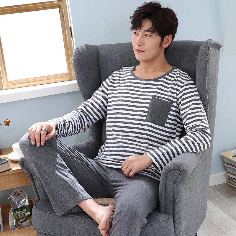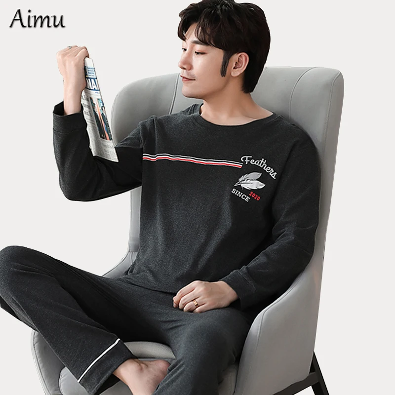Мужская одежда для сна осень-зима для отдыха с эластичным поясом Хлопковая мужская ночная рубашка с длинным рукавом Топ Длинные брюки Мужской пижамный комплект домашняя одежда