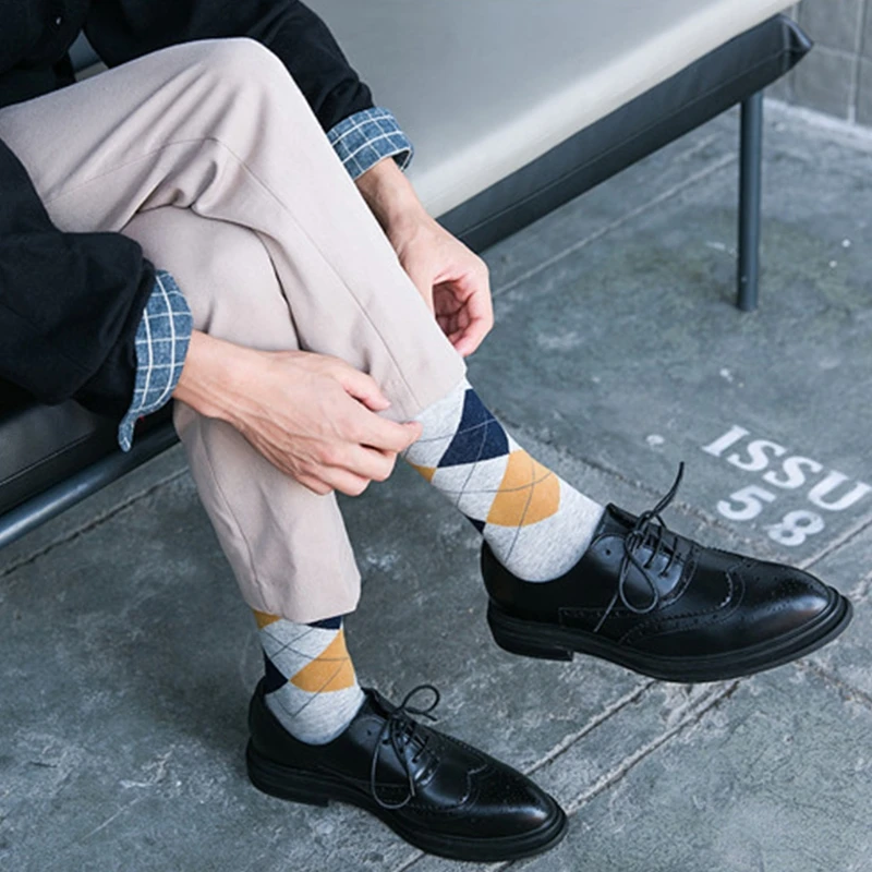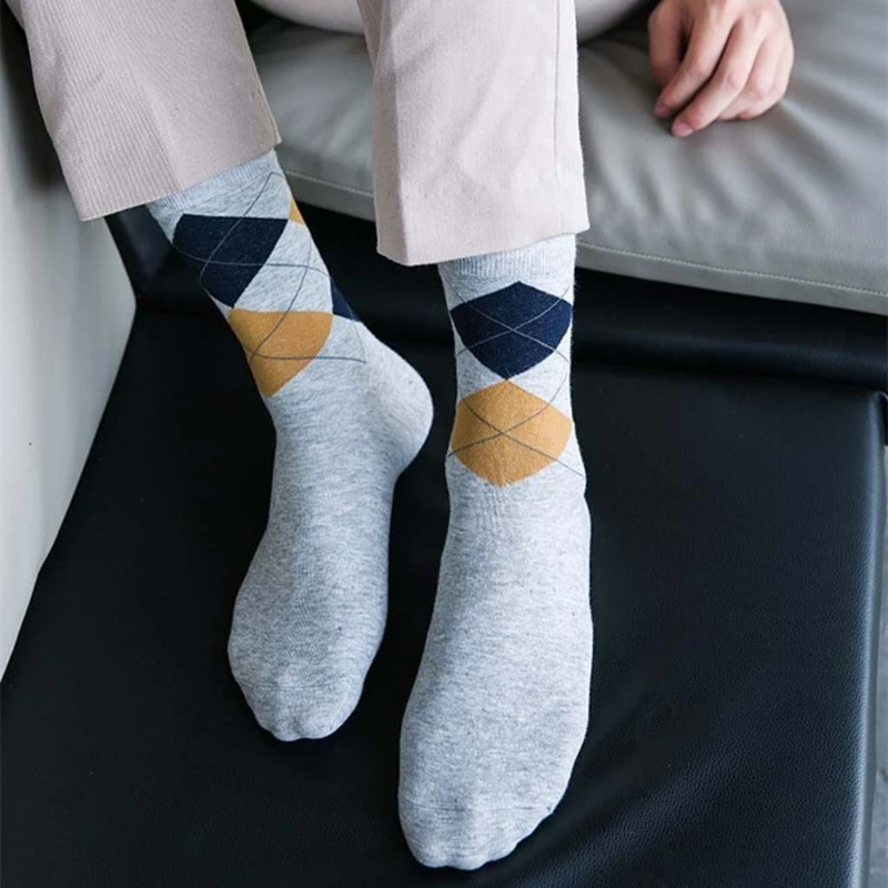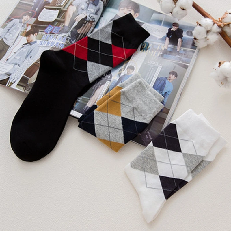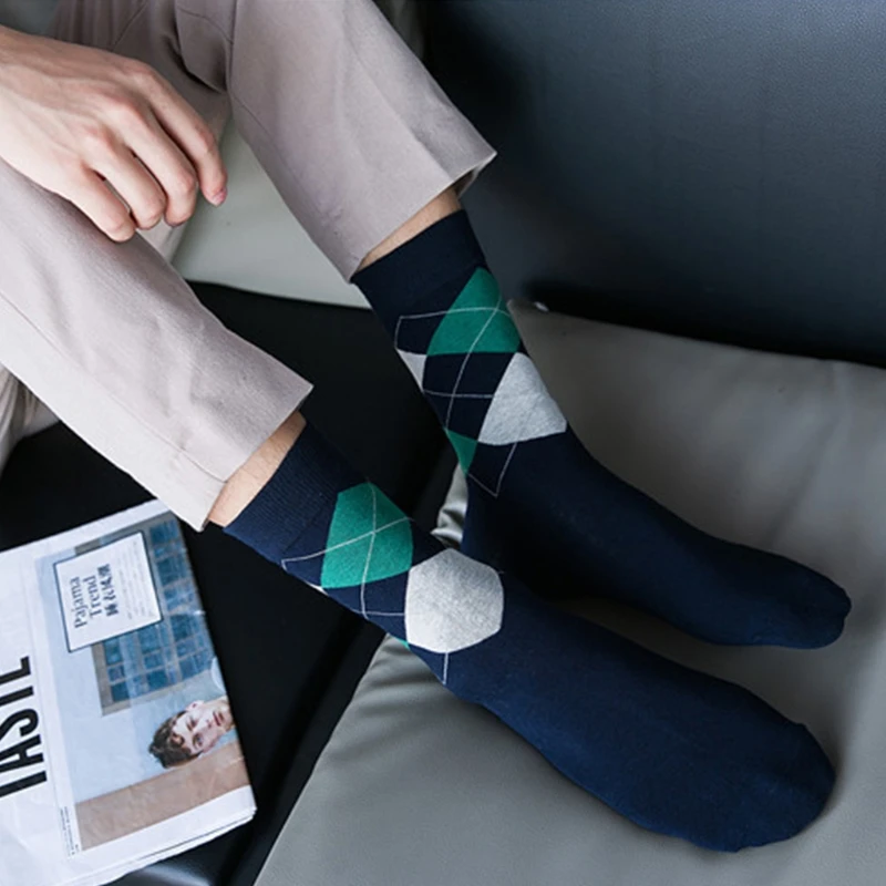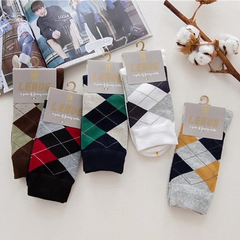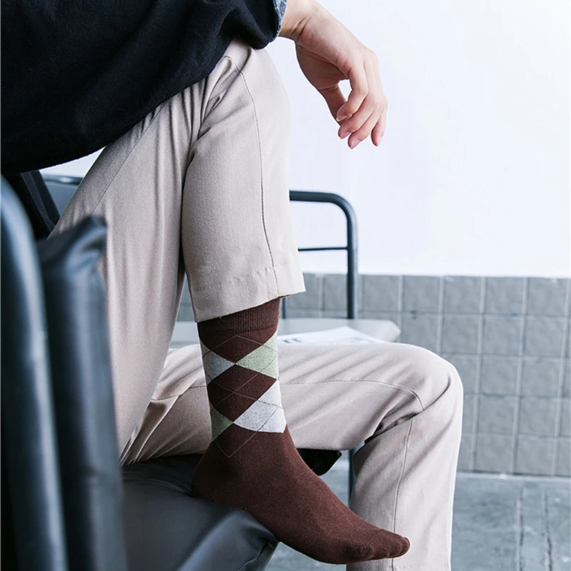 Носки мужские хлопковые в клетку, винтажные дышащие деловые повседневные средней длины, с рисунком ромбиками, контрастных цветов, для осени и зимы