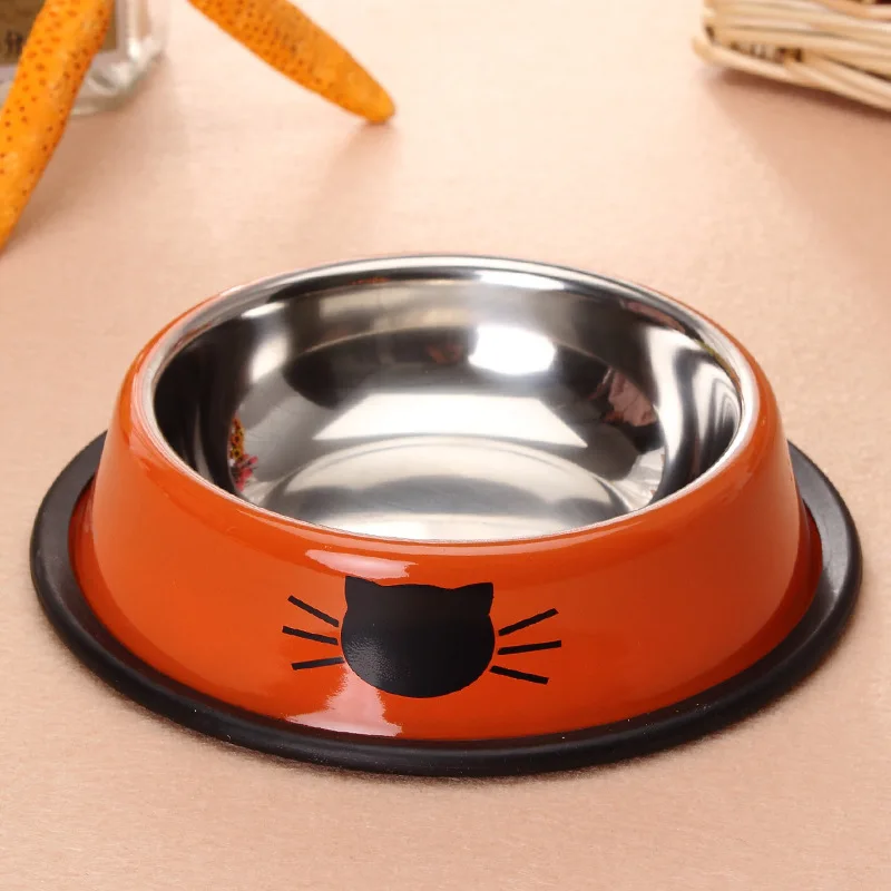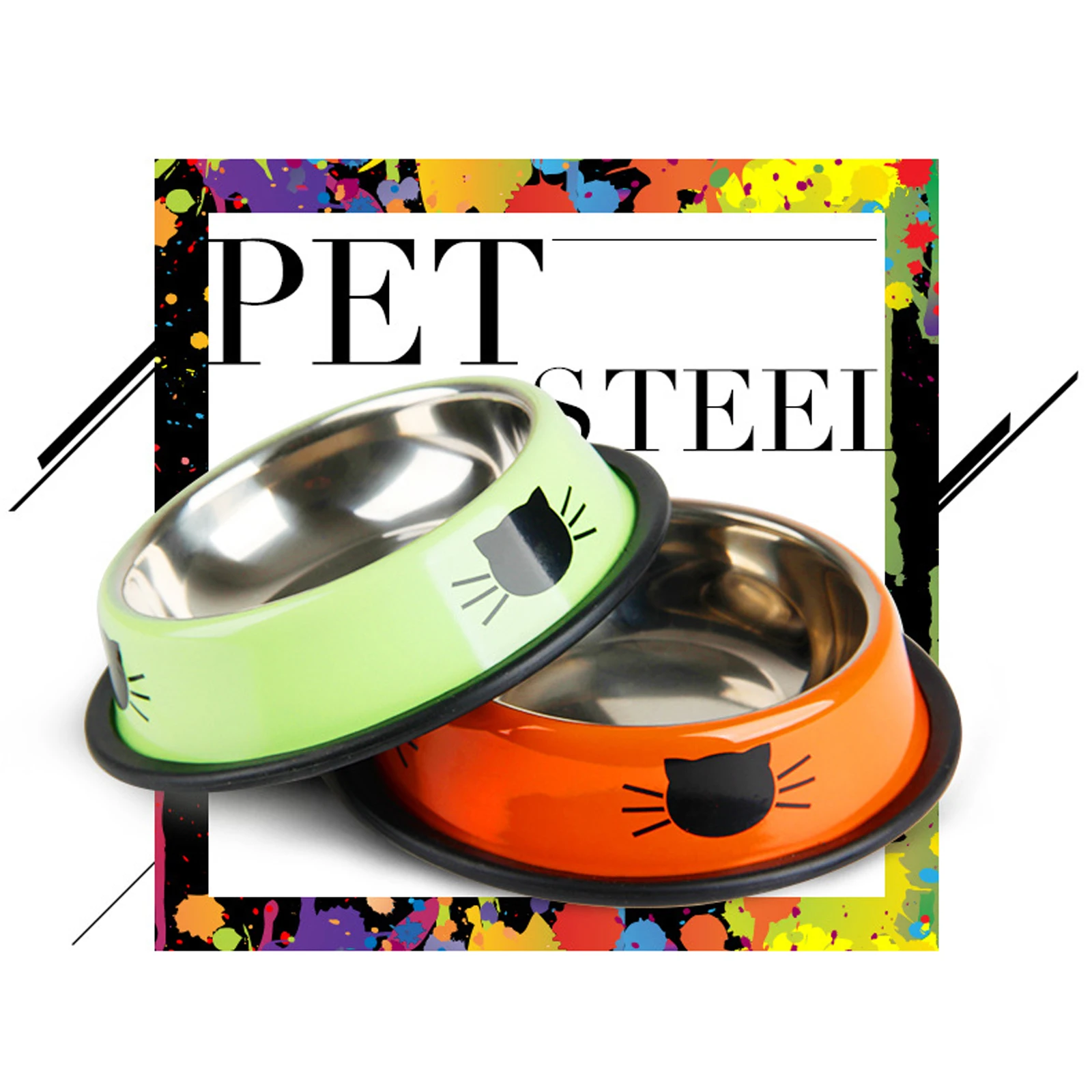 Миска для кошек из нержавеющей стали, модная многоцветная миска с мультяшным принтом милого кота, миска для еды с широким горлом и нескользящей устойчивой основой