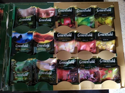 Коллекция пакетированного чая Greenfield представляет редкие сорта черного и зеленого плантационного чая, великолепные чайные композиции с ягодами, фруктами, лепестками цветов и душистыми травами и натуральные травяные чаи без содержания кофеина.
