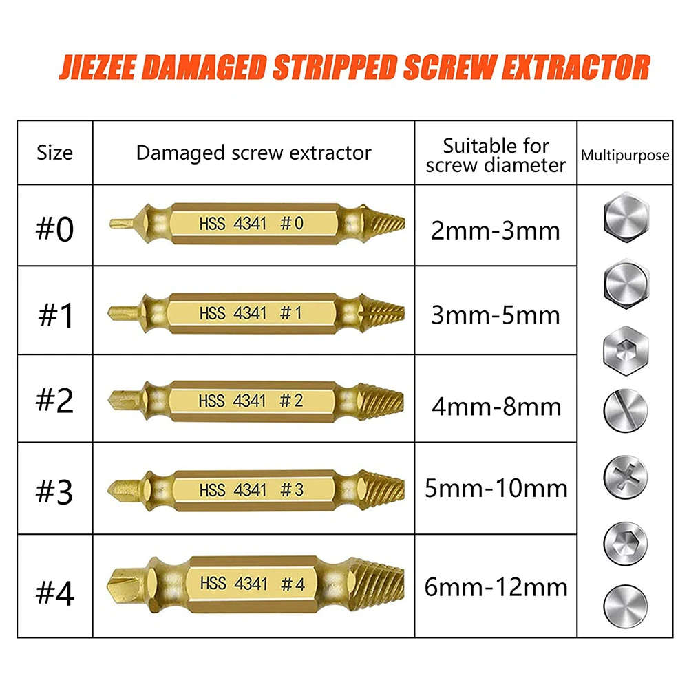 1. Широкое применение-набор экстракторов болтов (#0, #1, #2, #3, #4) Может использоваться с любым сверлом и любым размером винта или болта. Подходит для болтов с шестигранной головкой, болтов с квадратной головкой, деревянных винтов, винтов с шестигранной головкой, механических винтов, металлических пластин и т. Д. Полный размер простого набора экстракторов болтов может удовлетворить ваши уникальные потребности.
