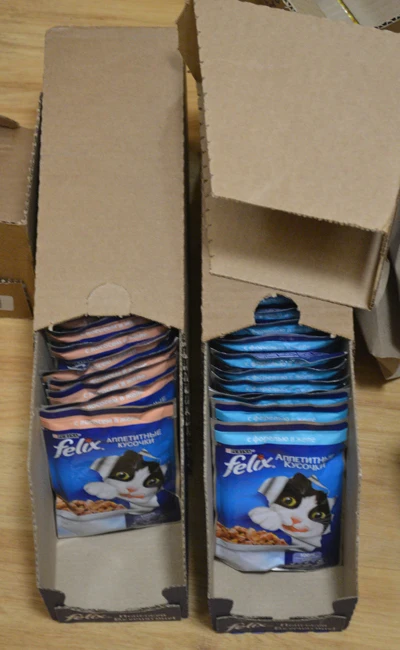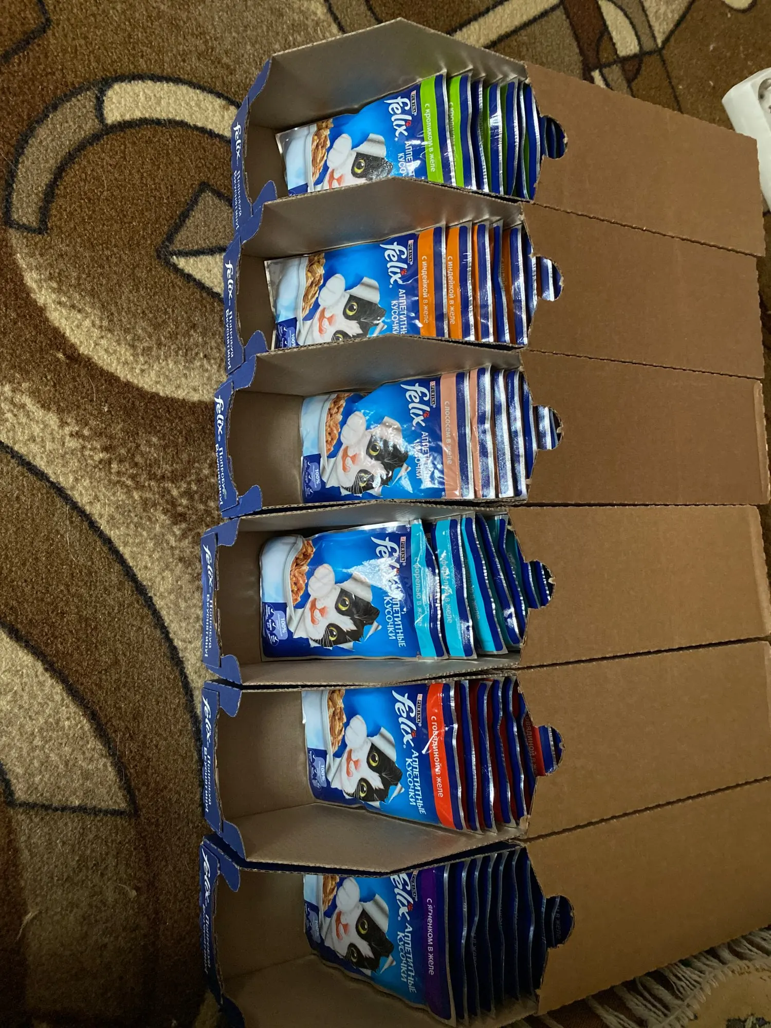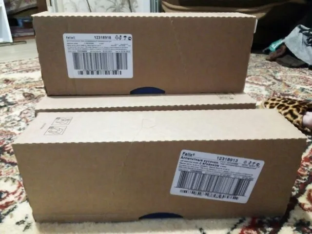 Доставка пара дней. Упаковано в фирменную коробку (заводскую), ну и почтовую. Все целое доехало, количество штук соответствует заявленному. Со сроками годности все идеально. Большое спасибо магазину! От котов отдельное спасибо) =(^.^)=