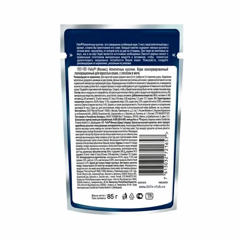 Феликс Аппетитные кусочки — это совершенно особенный корм. У него такой аппетитный вид и аромат, словно Вы приготовили его сами. Каждый пакетик содержит нежные кусочки в сочном желе — вкуснятину, от которой кота за уши не оттащишь. Они такие же аппетитные на вкус, как и на вид! Корм является источником необходимых Омега-6 жирных кислот с правильным сочетанием минеральных веществ и витаминов, чтобы полностью удовлетворить ежедневные потребности Вашей кошки. Пожалуйста, следуйте рекомендациям по кормлению, указанным на упаковке.