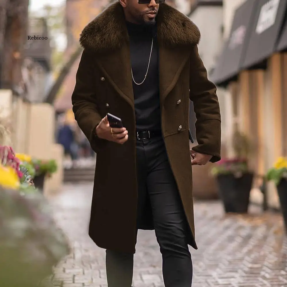 Пальто мужское шерстяное однотонное с мехом, длинное Модное теплое ...