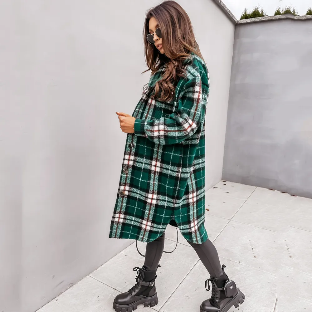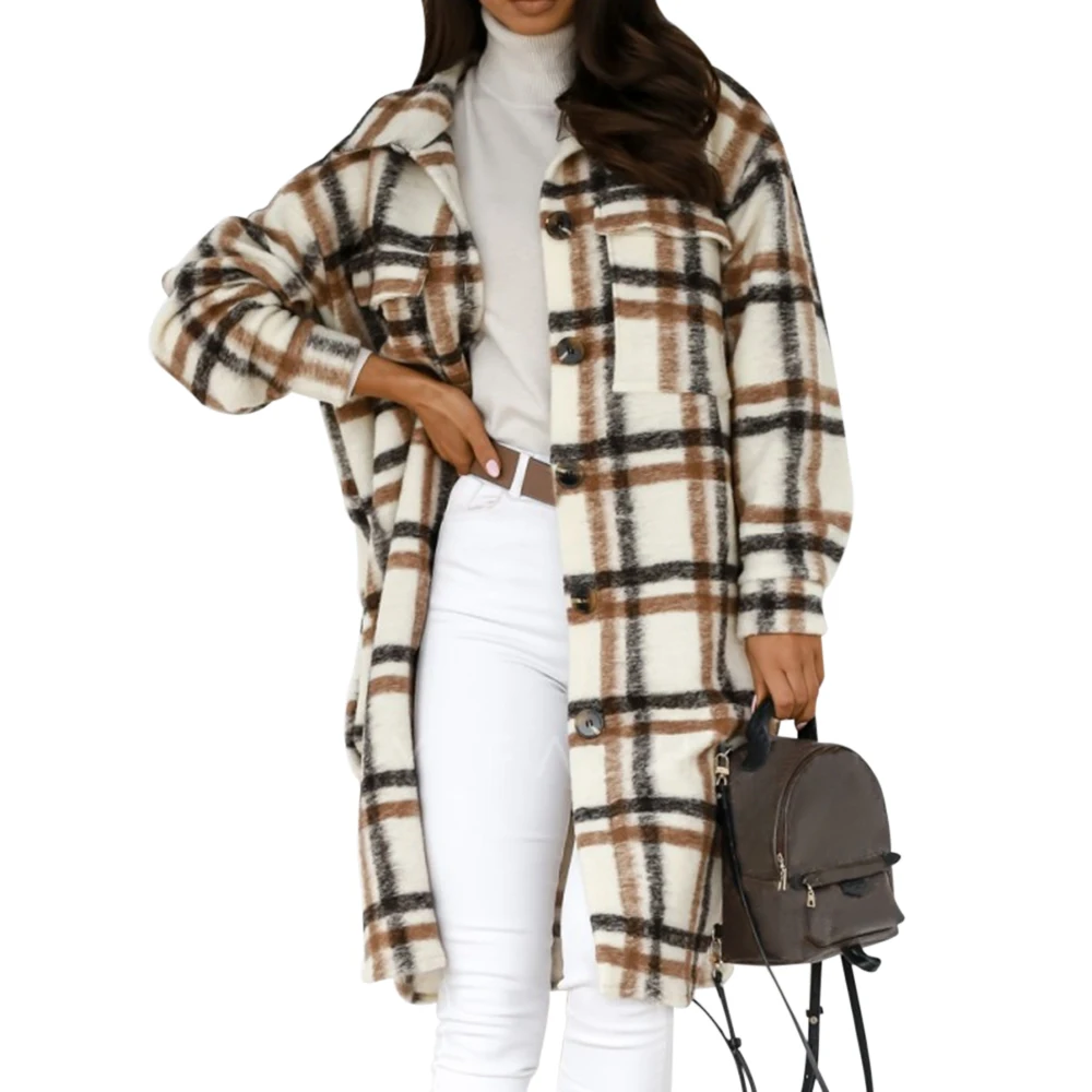 Женская клетчатая рубашка с длинным рукавом, осенне-зимняя модная свободная однобортная длинная куртка с отложным воротником, Женское пальто