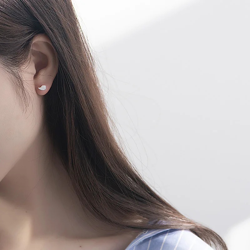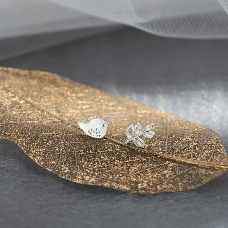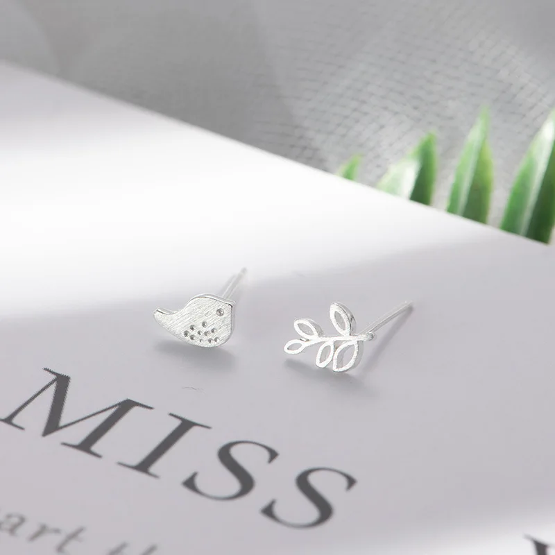 Серьги-гвоздики женские ассиметричные серебристые с птичьими листьями