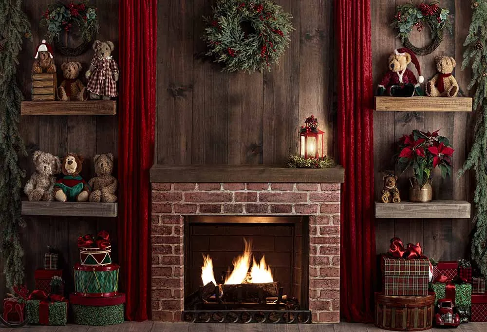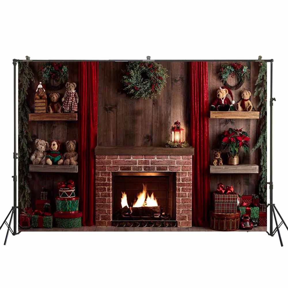 Фон для фотографирования с изображением рождественских фотографии камин Винтаж фон с изображением деревянной стены игрушечного медведя украшения Xmas фон для студийной съемки с изображением W-4792